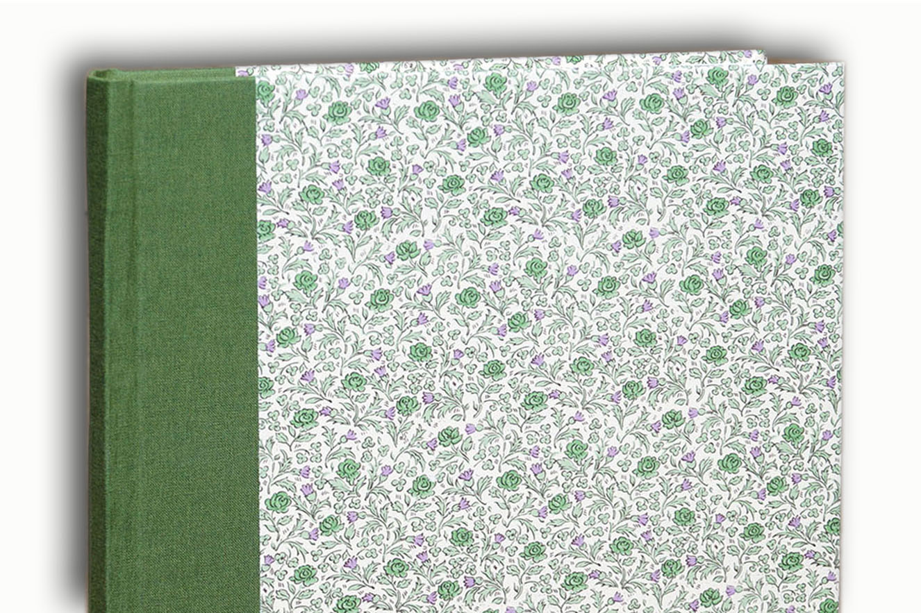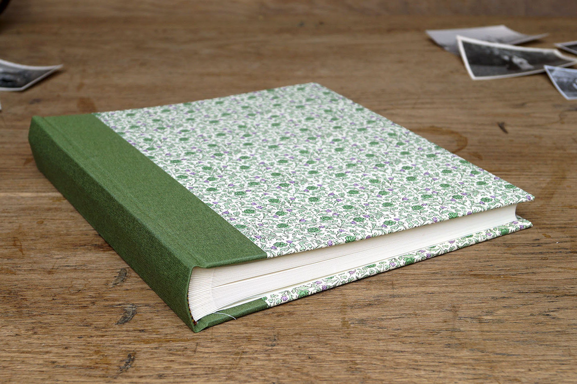 Fotoalbum mit 30 Blatt (60 Seiten) Fotokarton (bei Maxi 50 sind es 50 Blatt = 100 Seiten), in zarten Farbtönen bedruckt - eine Kombination aus grünen und fliederfarbenen Blüten beeindruckt auf dem Einband unseres handgefertigten Produkts.