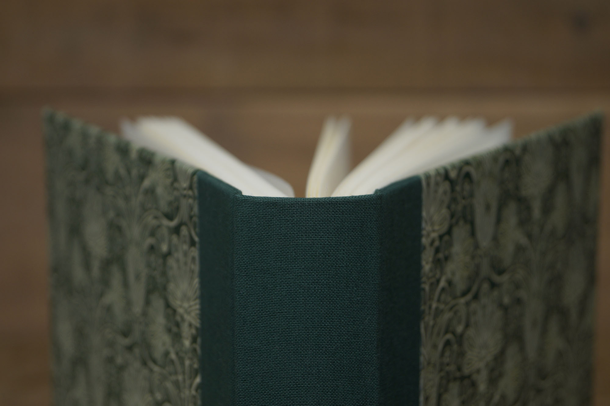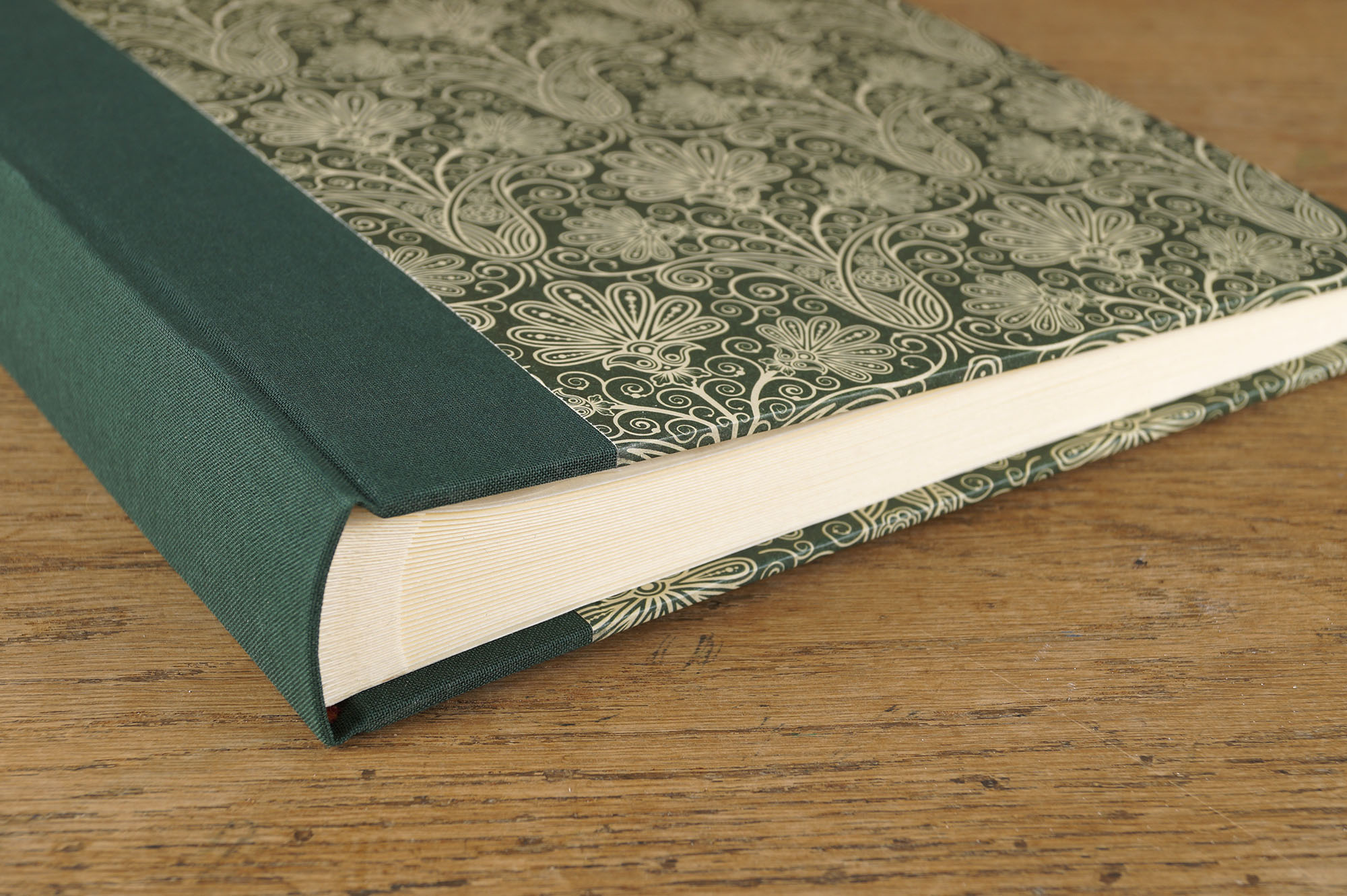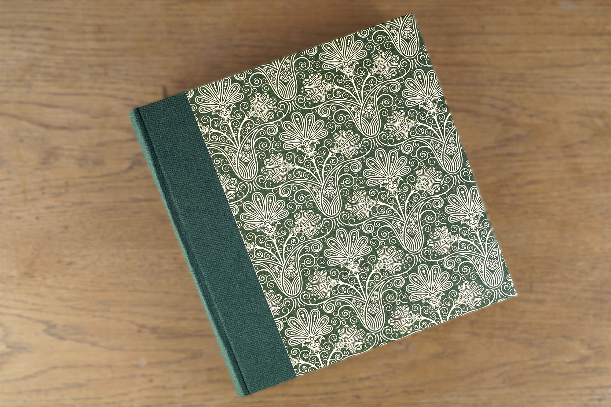 Der Rücken dieses individuellen Fotoalbums besteht aus dunkelgrünem Leinen, der gleichzeitig robust und fein gewebt ist.