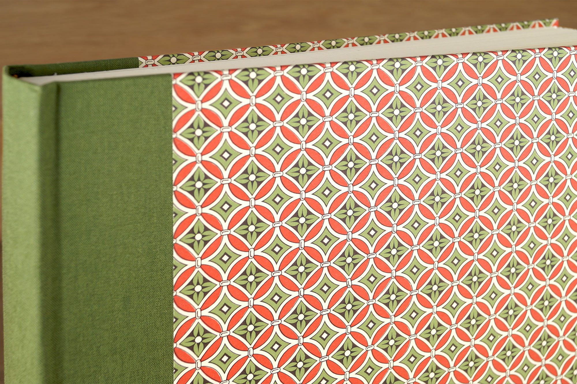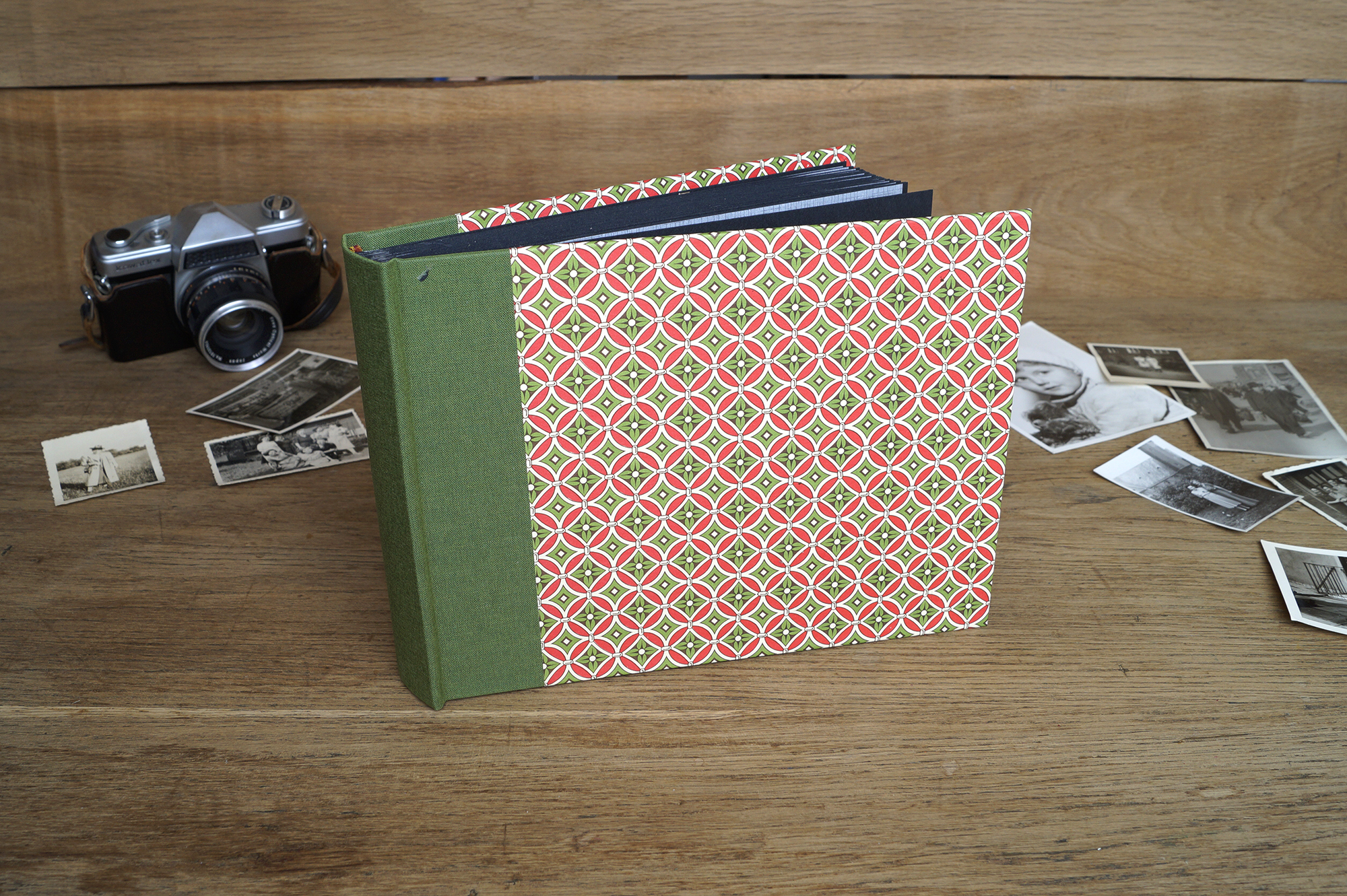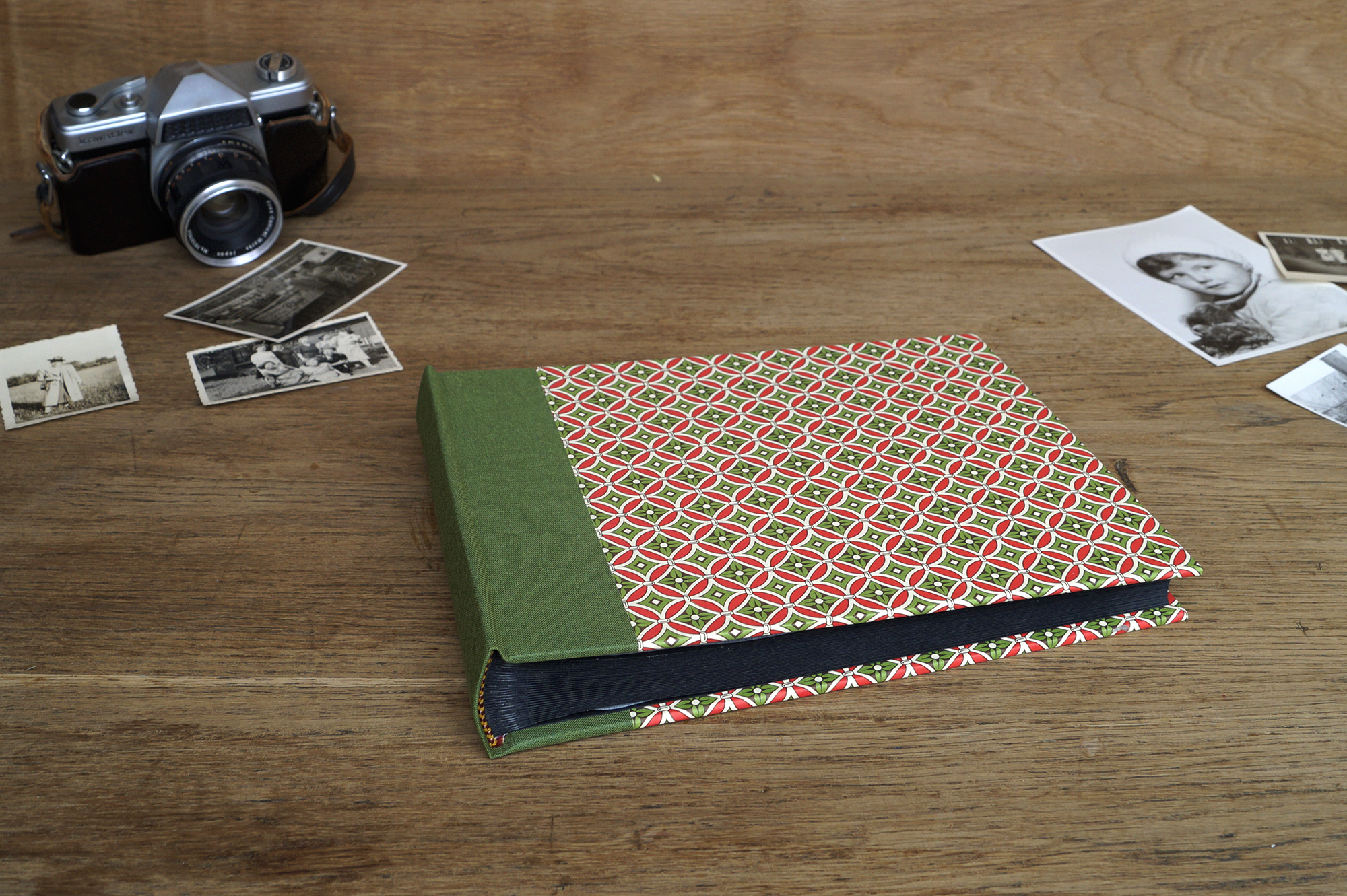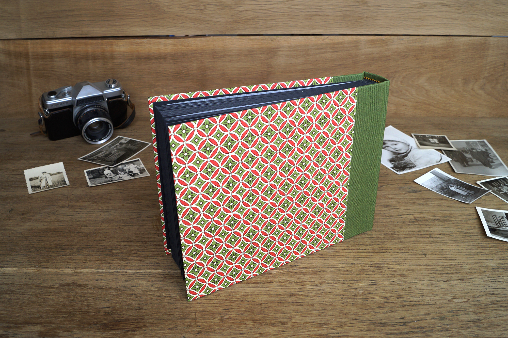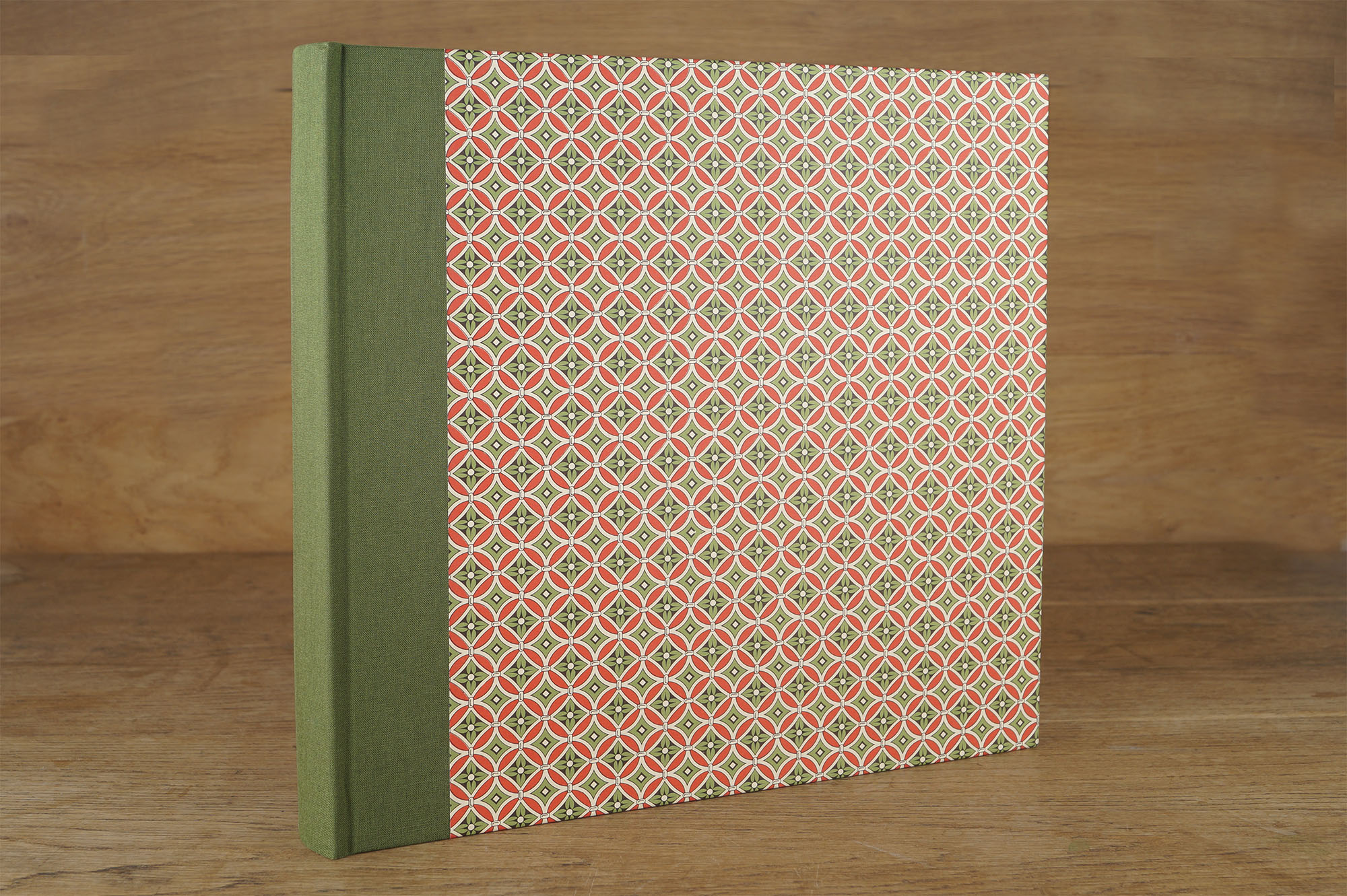 Dieses Fotoalbum Sepp ist kaschiert mit einem klassischen Buntpapier in den Farben rot, grün und altweiß.