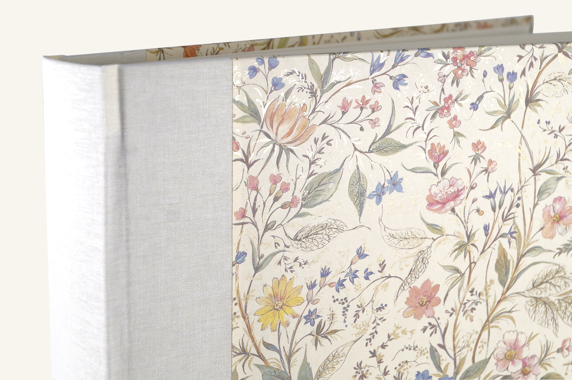 Hier sollte man genau hinschauen: zarte Blüten und Gräser in Pastelltönen schmücken das romantisch anmutende Einbandpapier. Das i - Tüpfelchen sind dezent aufgebrachte Vergoldungen, die dem Papier eine besondere Eleganz verleihen. Bestechend ist die hohe Druckqualität dieses Einbandpapiers.