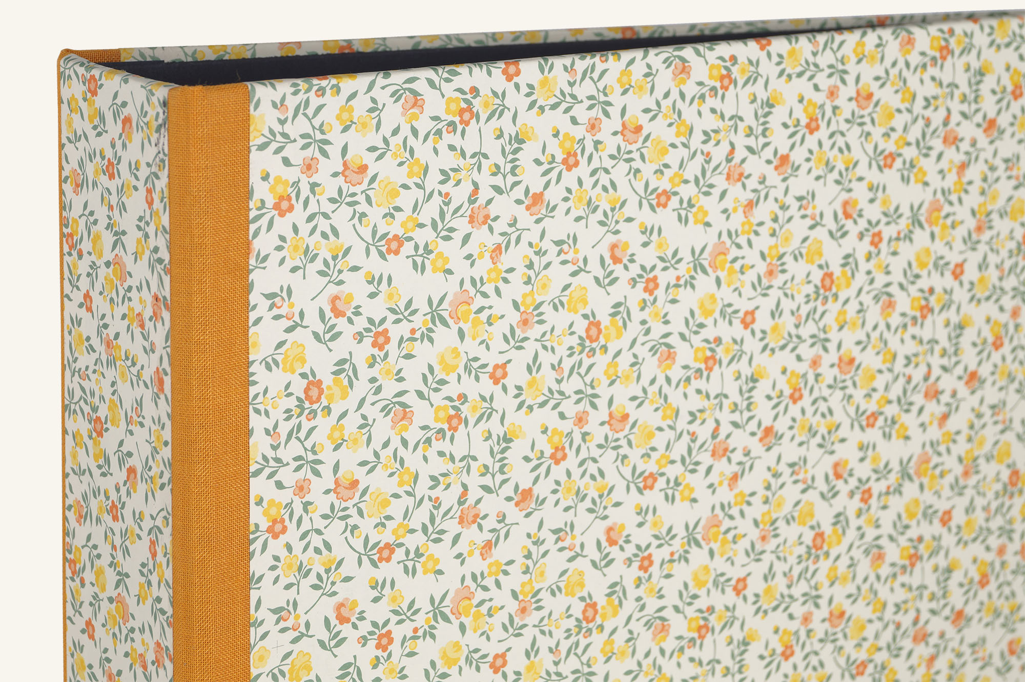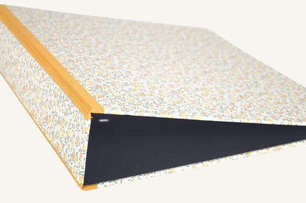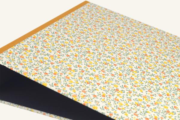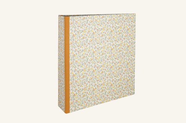 Unser Büroordner Vroni von Schreibweise sorgt mit seinem frischen Design sicher für gute Laune! Er ist gefertigt aus extra starker Buchbinderpappe und ist ausgestattet mit einer Hebelmechanik. Bezogen ist er mit einem italienischen Buntpapier, worauf gelbe - und orangefarbene Blüten gedruckt sind. Das Innere des Ordners ist in mattem schwarz ausgekleidet.