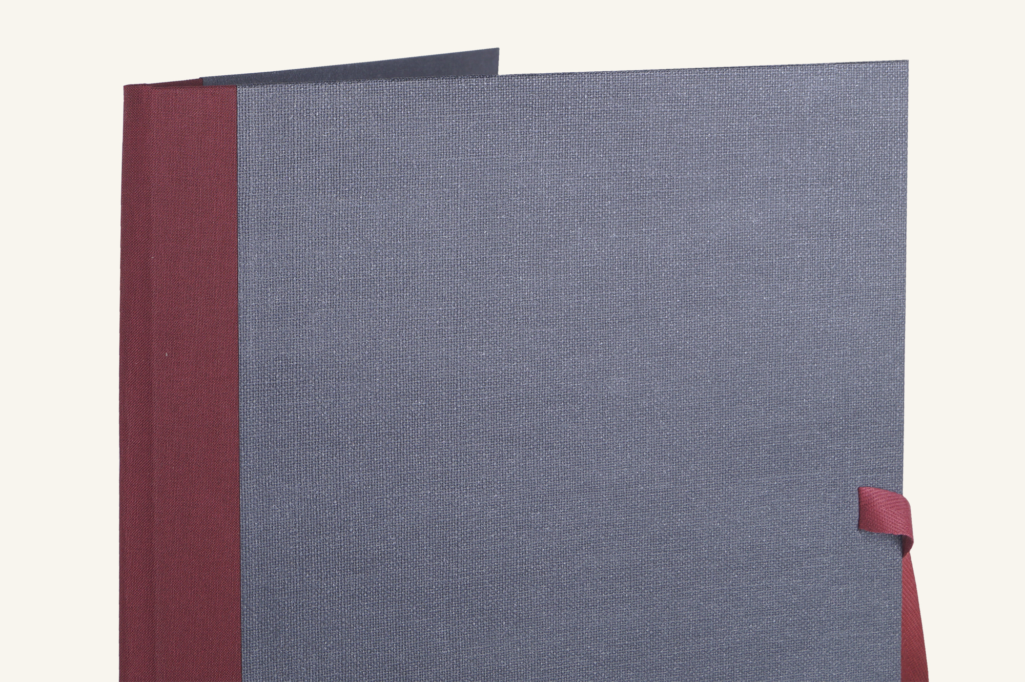 Wunderbar griffiges Bezugsmaterial mit geprägter Oberfläche in Canvas - Struktur.Im Kontrast dazu steht der weinrote Leinen, der der Notenmappe einen flexiblen und soliden Rücken gibt.