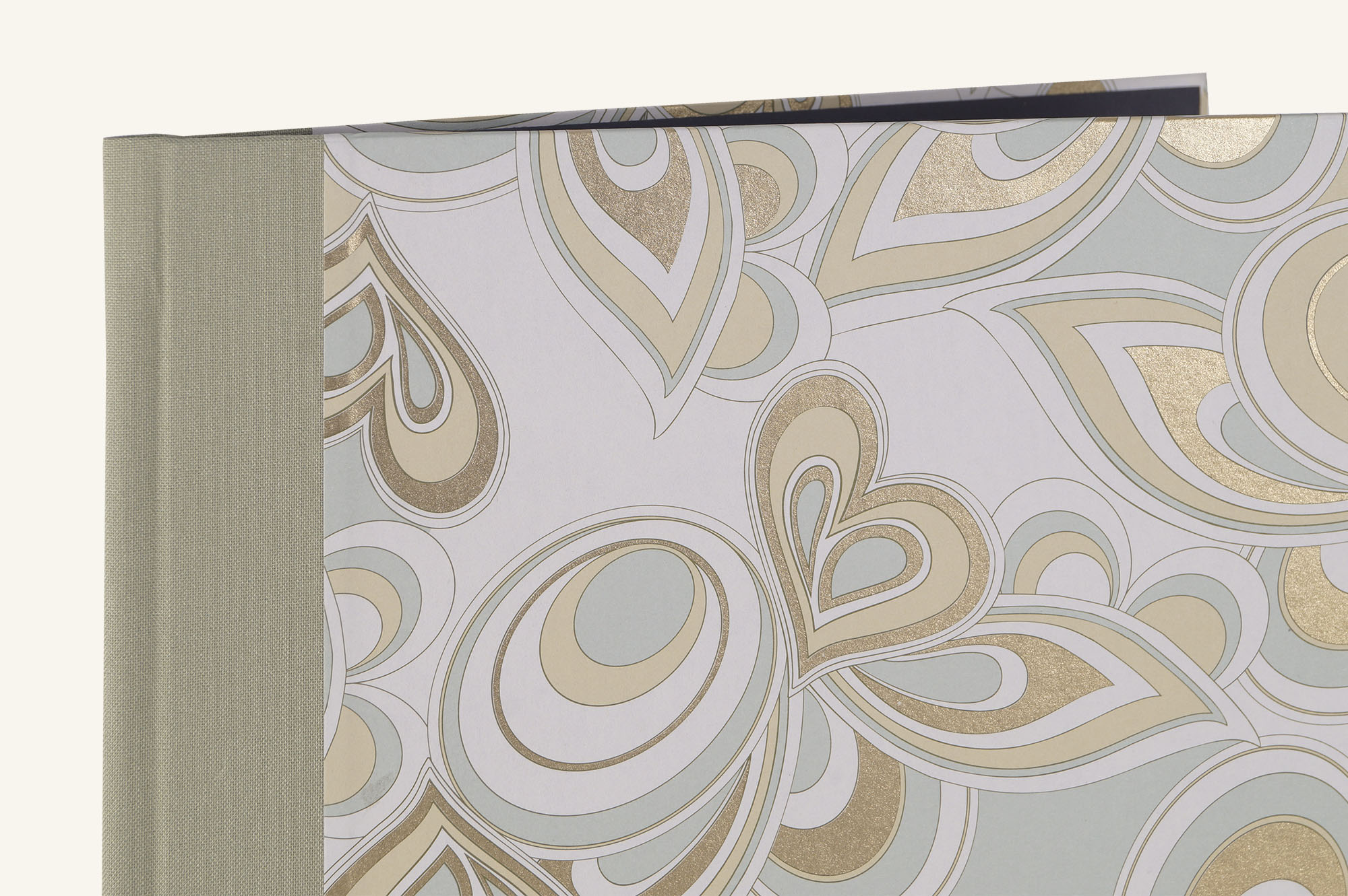 Die handgefertigte Mappe besteht aus fester Buchbinderpappe und ist bezogen mit Gold veredeltem Papier. In einem aufwändigen Druckverfahren wird vorerst die Farbe aufgetragen. Im weiteren Schritt wird das Papier partiell mit einer Trägerflüssigkeit für Goldstaub versehen und damit bestäubt. So entsteht eine besondere Haptik und eine intensive Leuchtkraft der Farben. Diese Qualität spürt und sieht man!