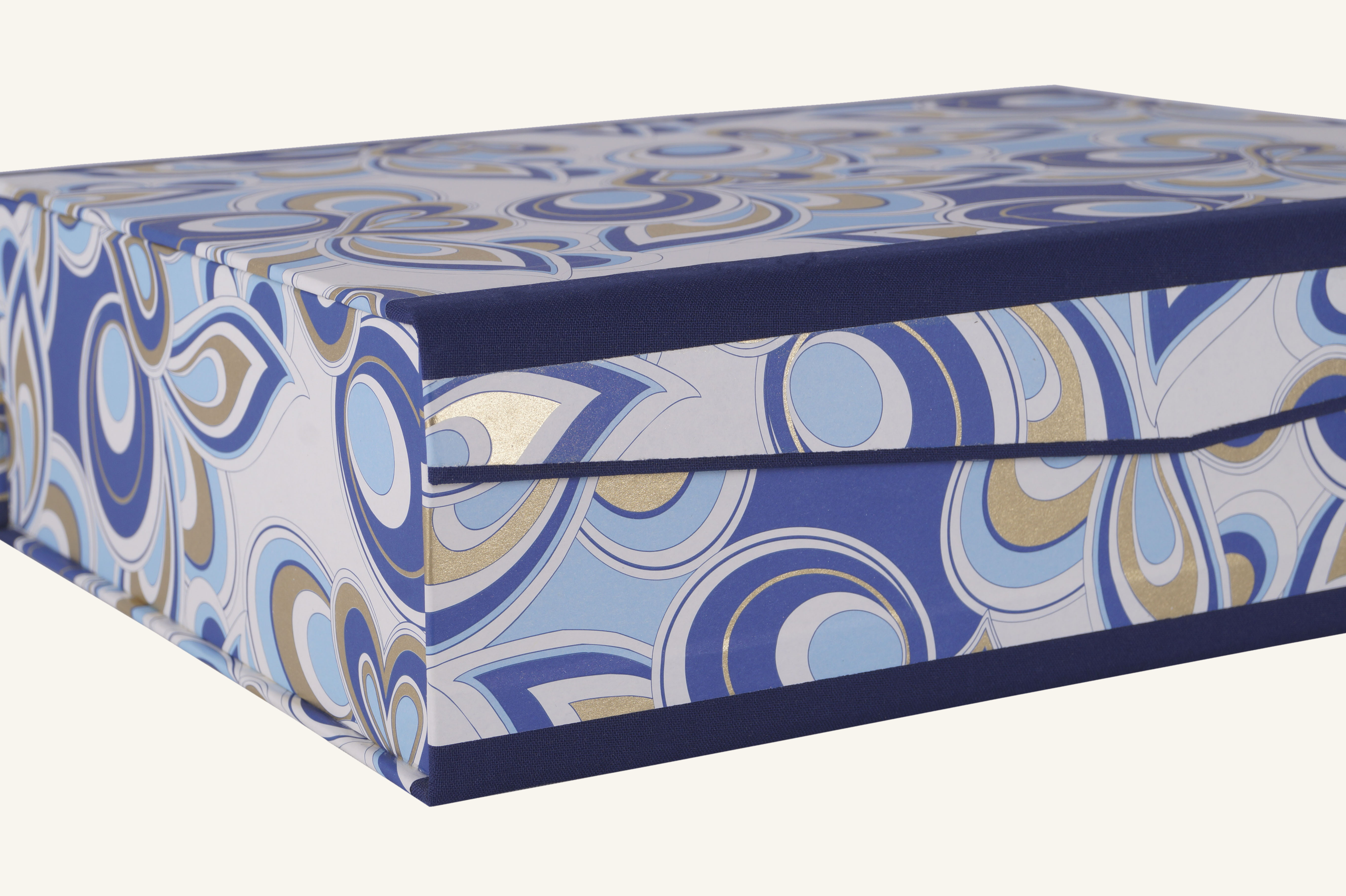 Eine prägnant geschwungene, dynamische Formensprache in kräftigen Farben und Echtgold schmücken die Flächen dieser eleganten Schachtel."Plymouth" ist, wie "Bristol", eine im besten Wortsinne organische design-Serie aus der Papeterie - Schreibweise - Kollektion. Elegant und farbenfroh zieren diese Motive unsere Papeterie - Produkte. Die Boxen werden zudem mit feinem Leinengewebe an den Horizontalkanten ergänzt. Das gibt sowohl höhere Festigkeit aufgrund der Größe der Schachteln als auch einen optischen Vorteil, da die Flächen etwas aufgelockert werden.