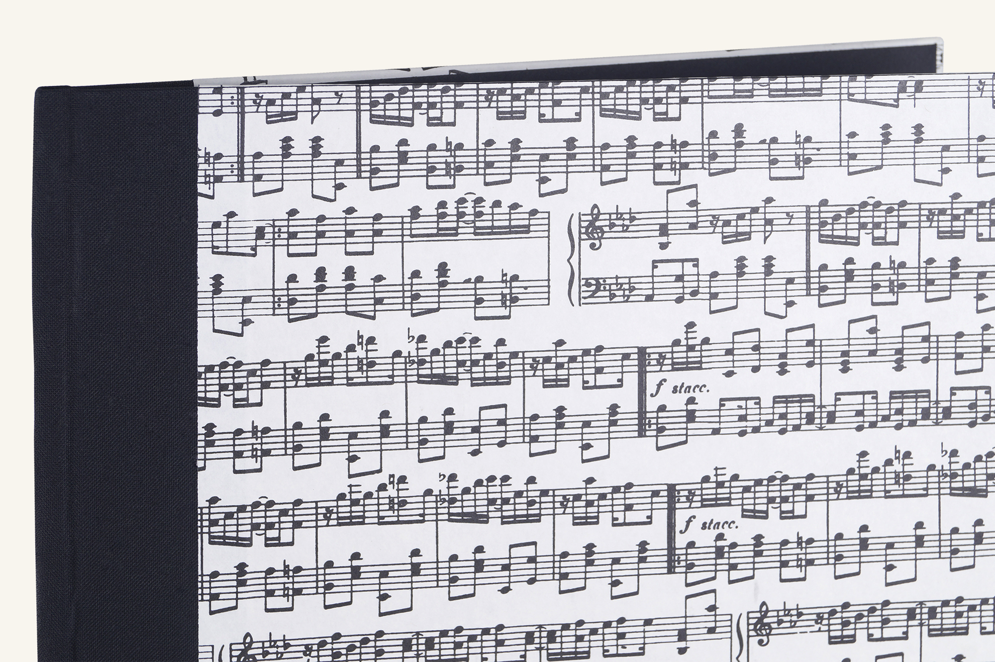 Bezogen ist die Mappe mit Notenpapier in schwarz/weiß, innen befindet sich schwarzer Fotokarton.
