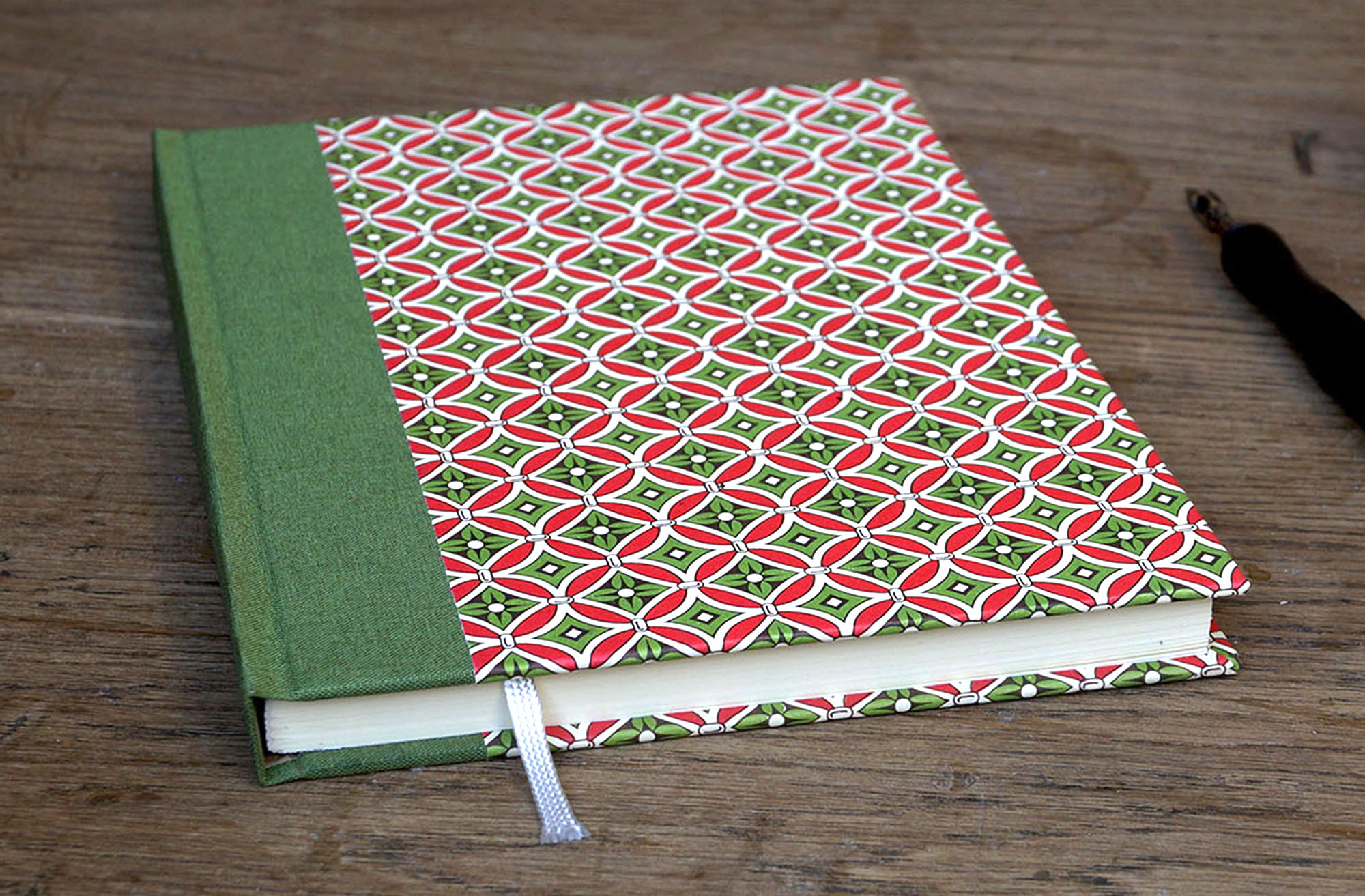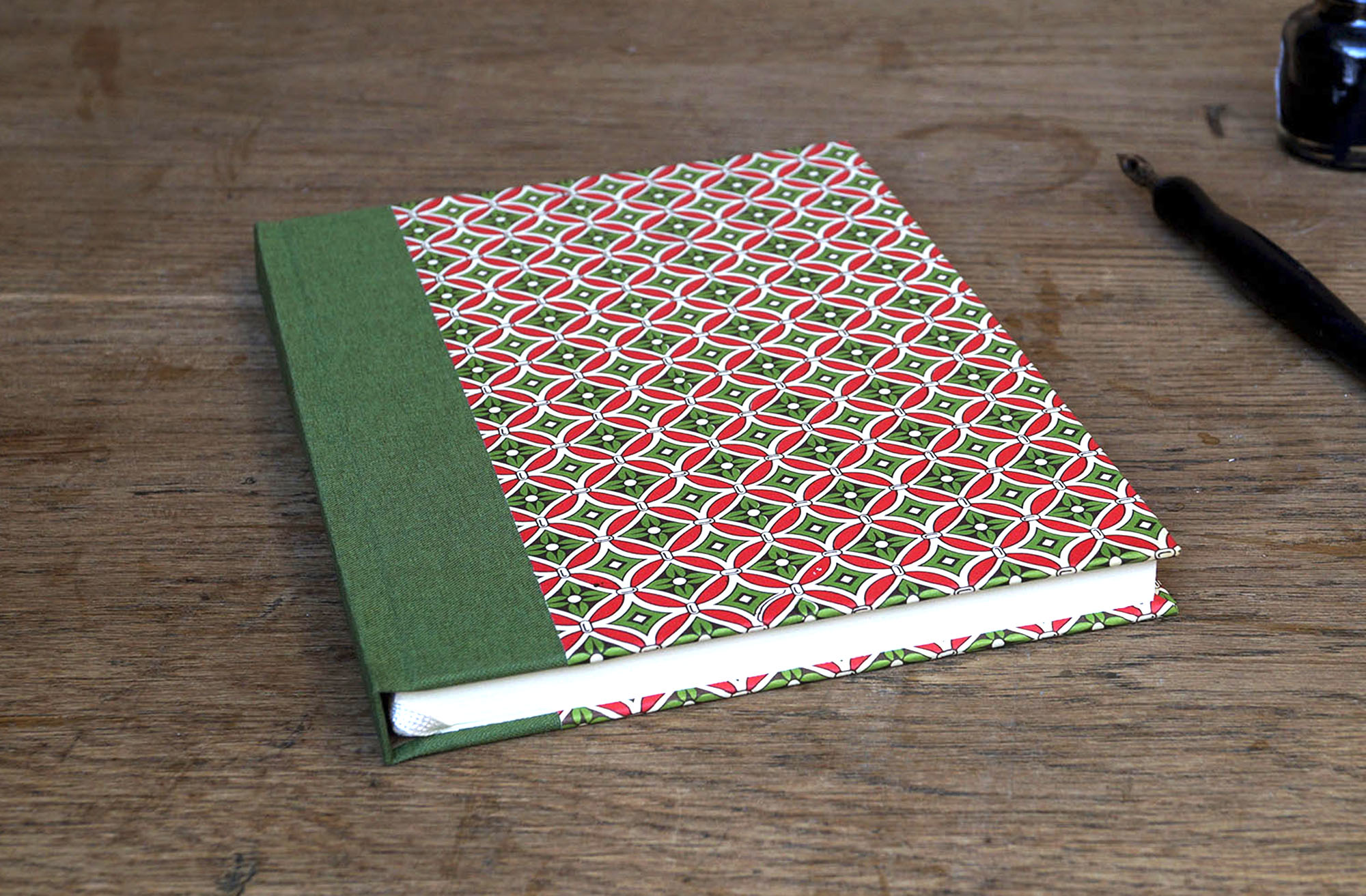 Die Farbigkeit in rot und olivgrün harmoniert mit dem mit olivgrünen Leinen bezogenen Buchrücken.