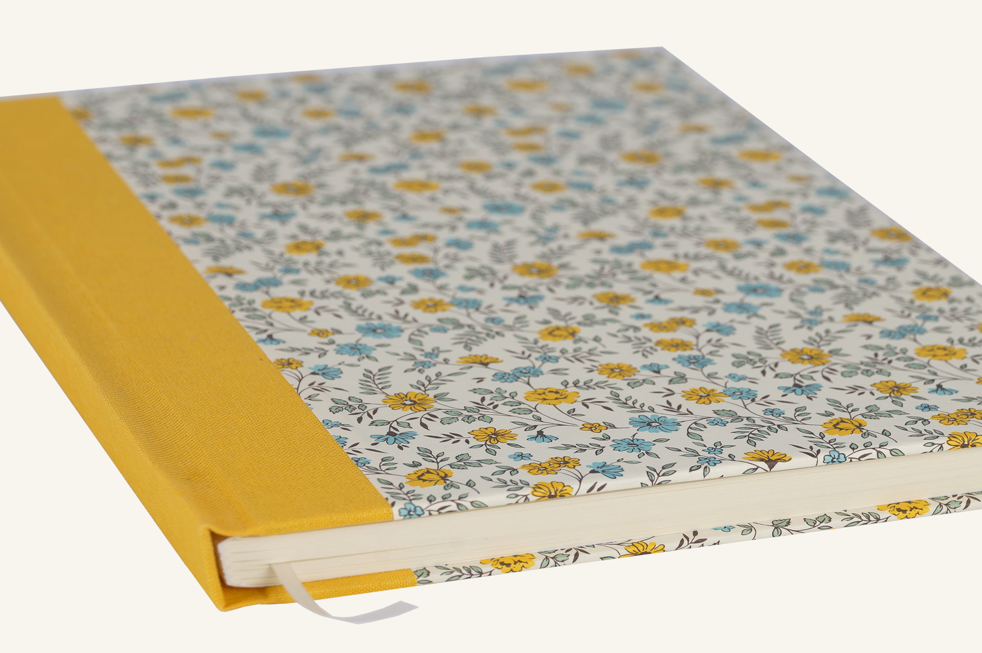 Der feste Buchumschlag ist bezogen mit italienischem Buntpapier in fröhlichen Farben. Das gelb-blaue Blumenmuster fällt sofort ins Auge und sorgt garantiert für gute Laune.
