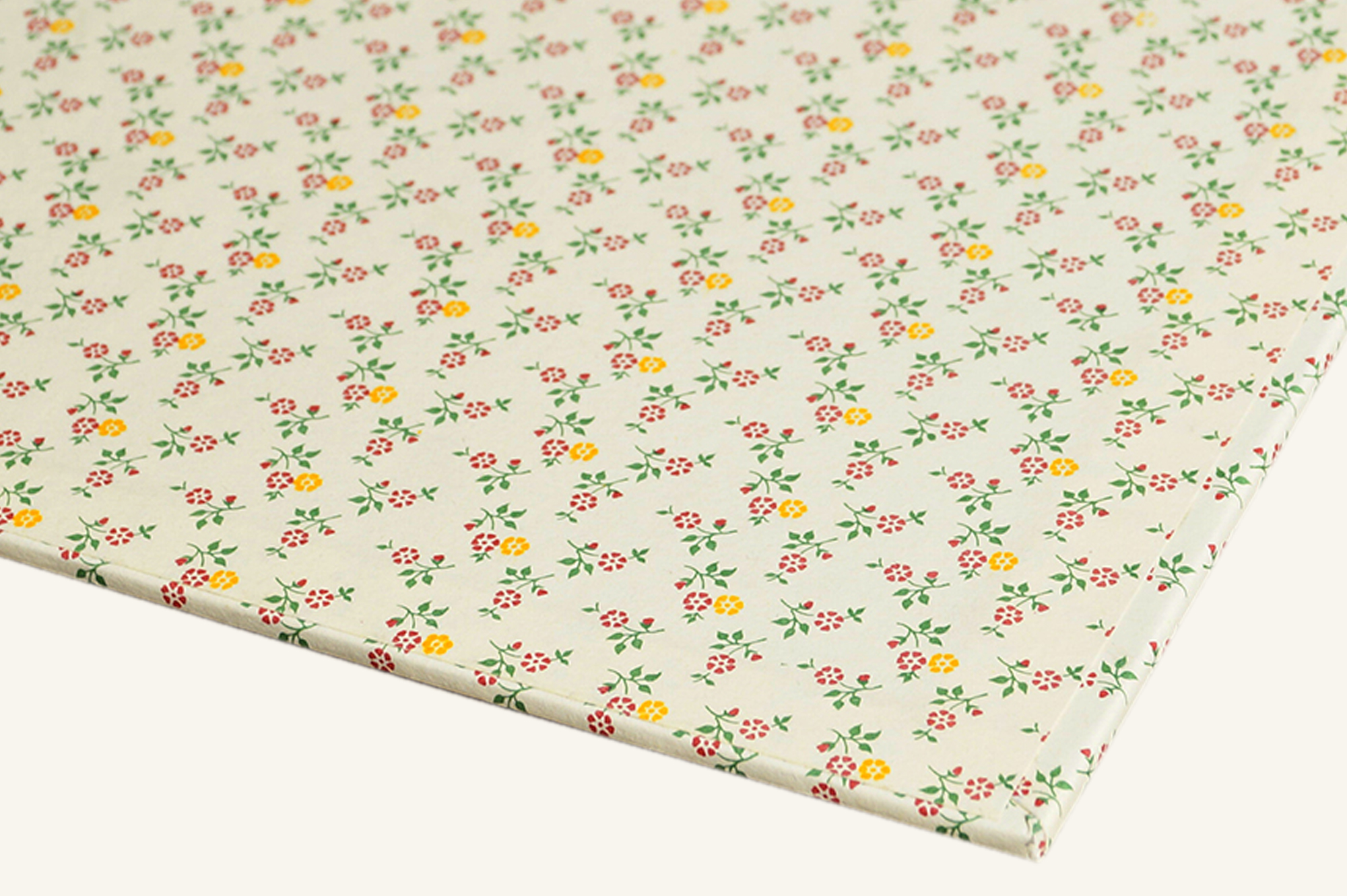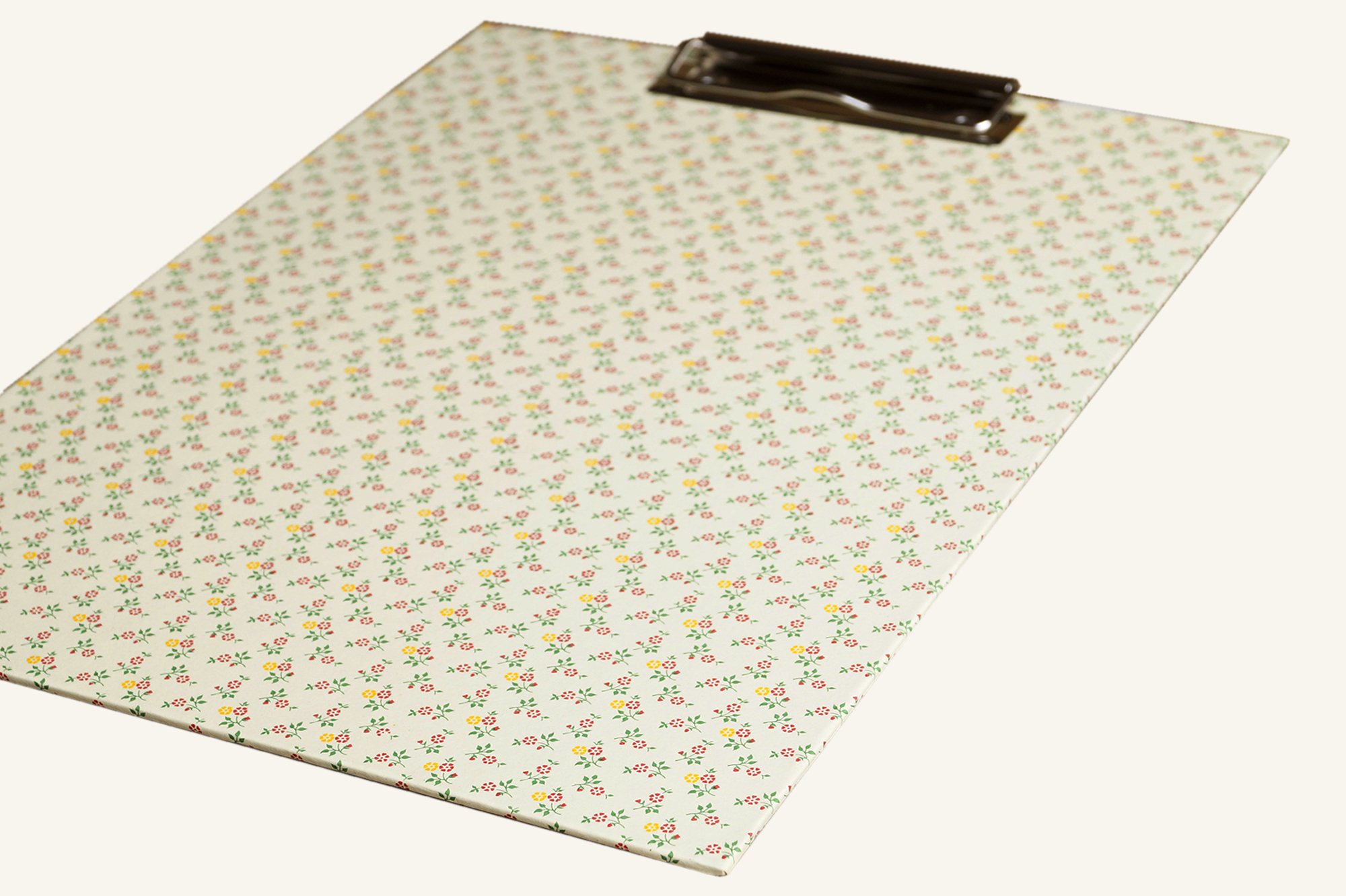 Unser Klemmbrett mit feingezeichnetem Blümchenmotiv erinnert ein wenig an die Tapeten aus vergangener Zeit. - Blümchen in rosa und gelb finden sich in Reihe gedruckt als durchlaufendes Muster.