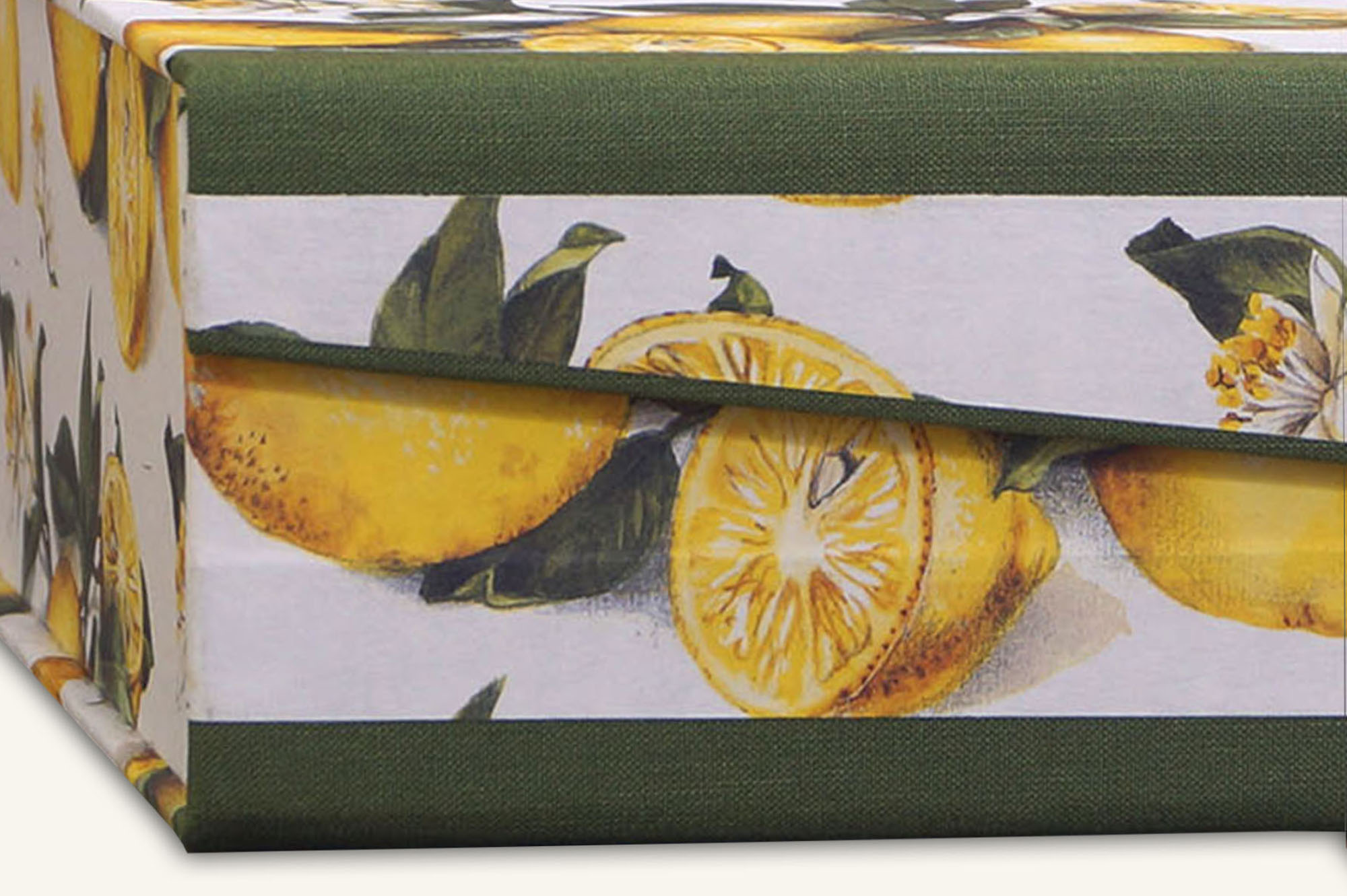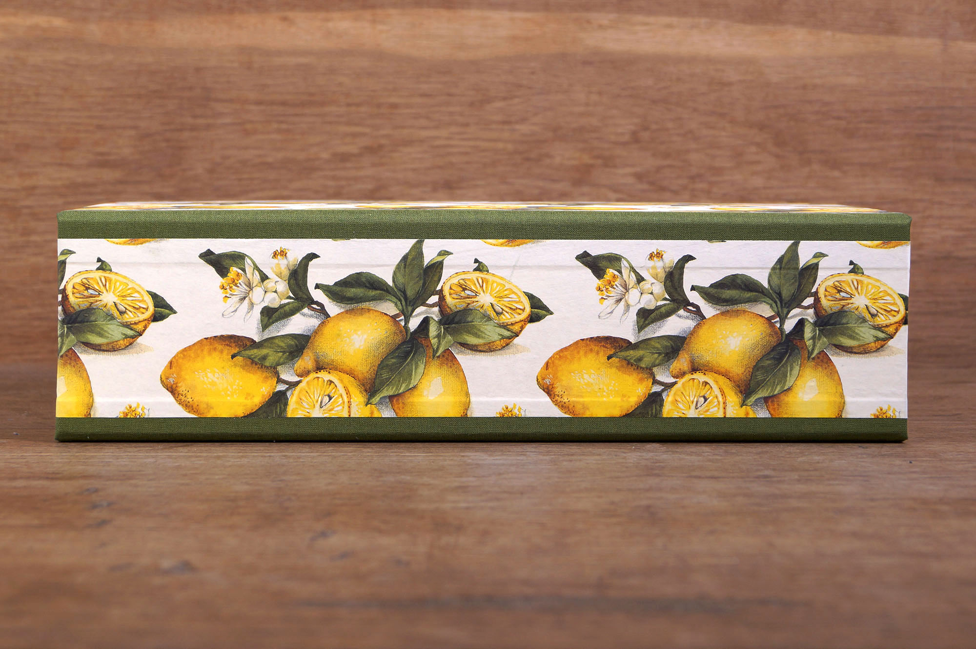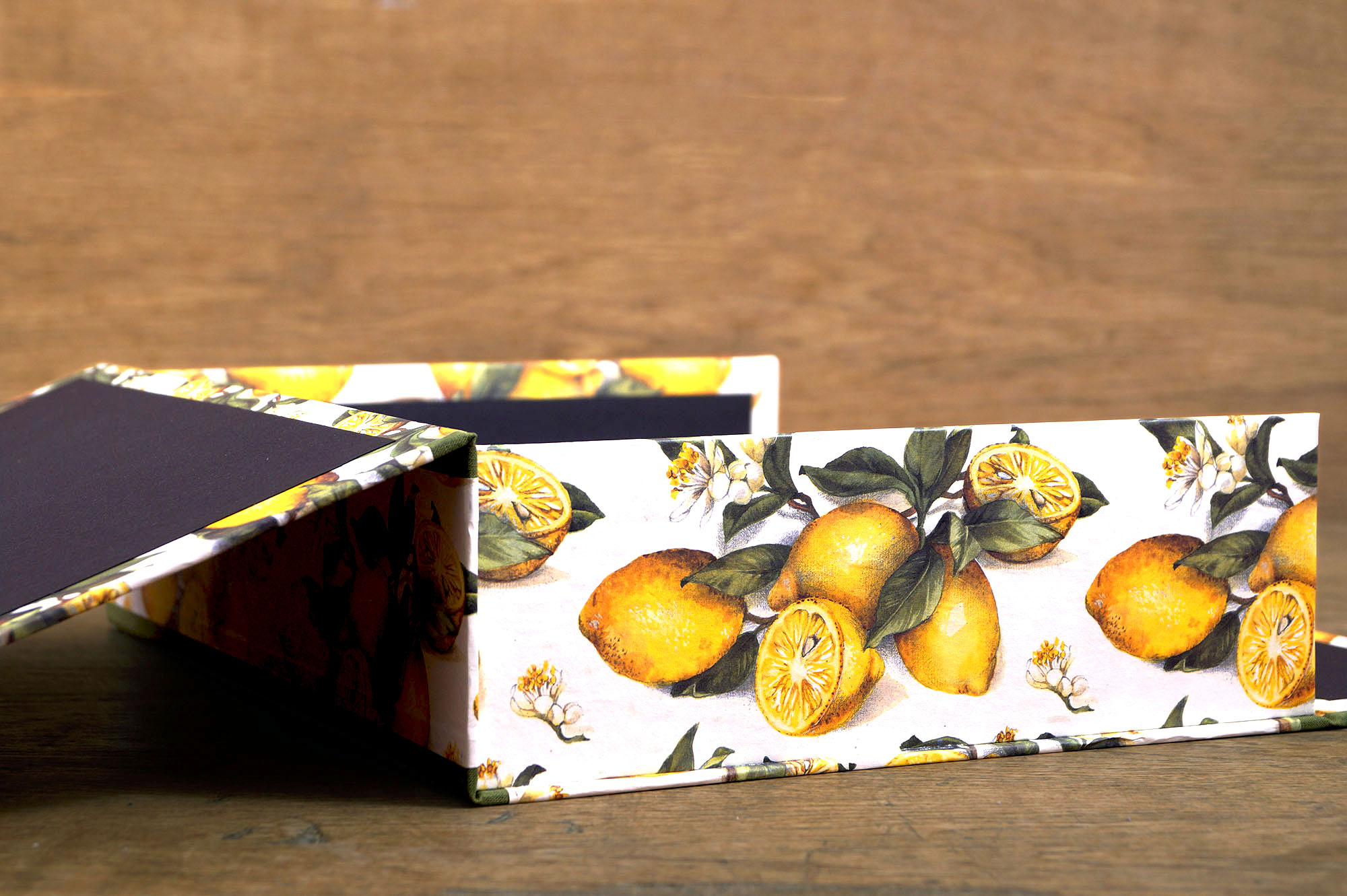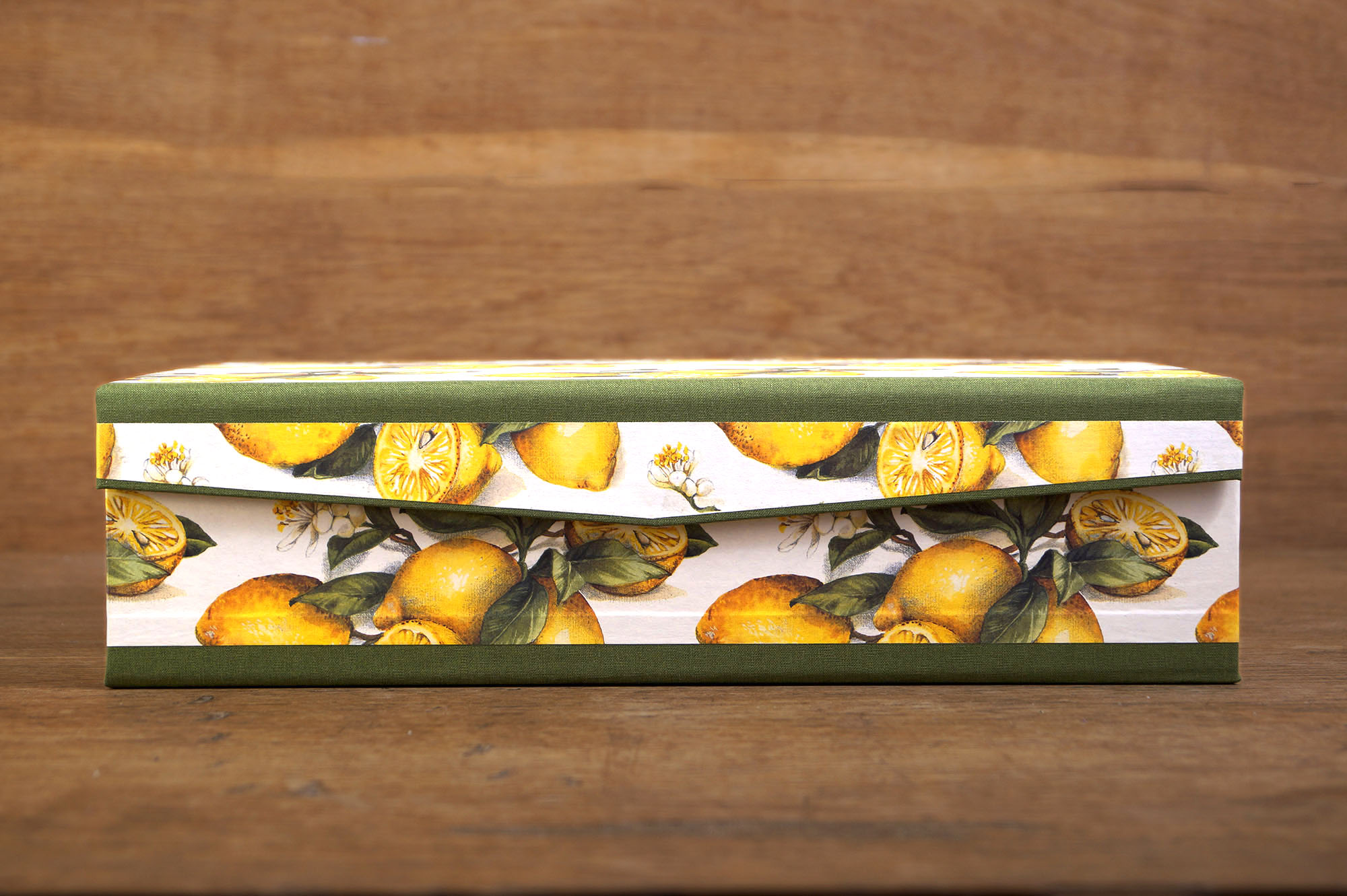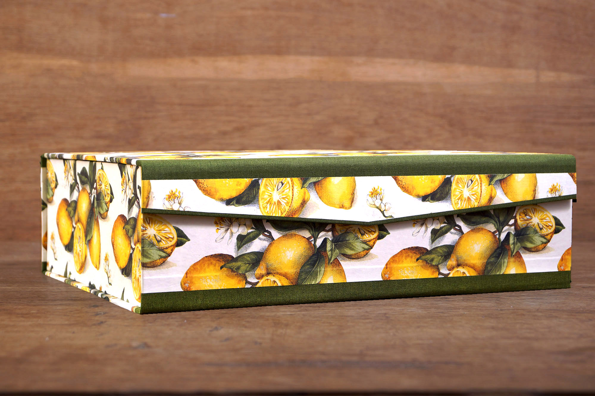 Erst recht, wenn so wunderschön gezeichnete Zitronen das Äußere einer handgefertigten Schachtel wie dieser im Schreibweise - Design zieren.