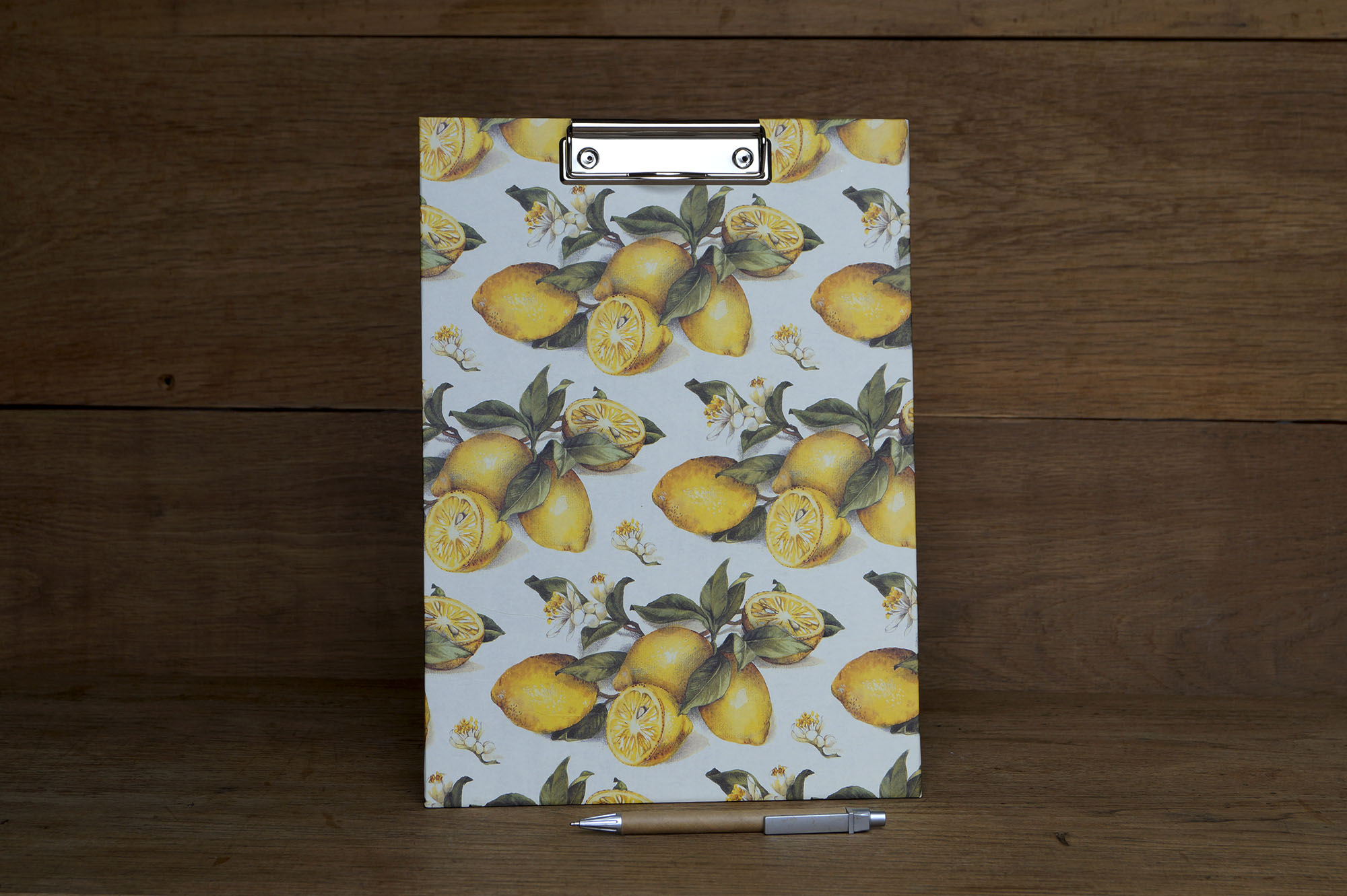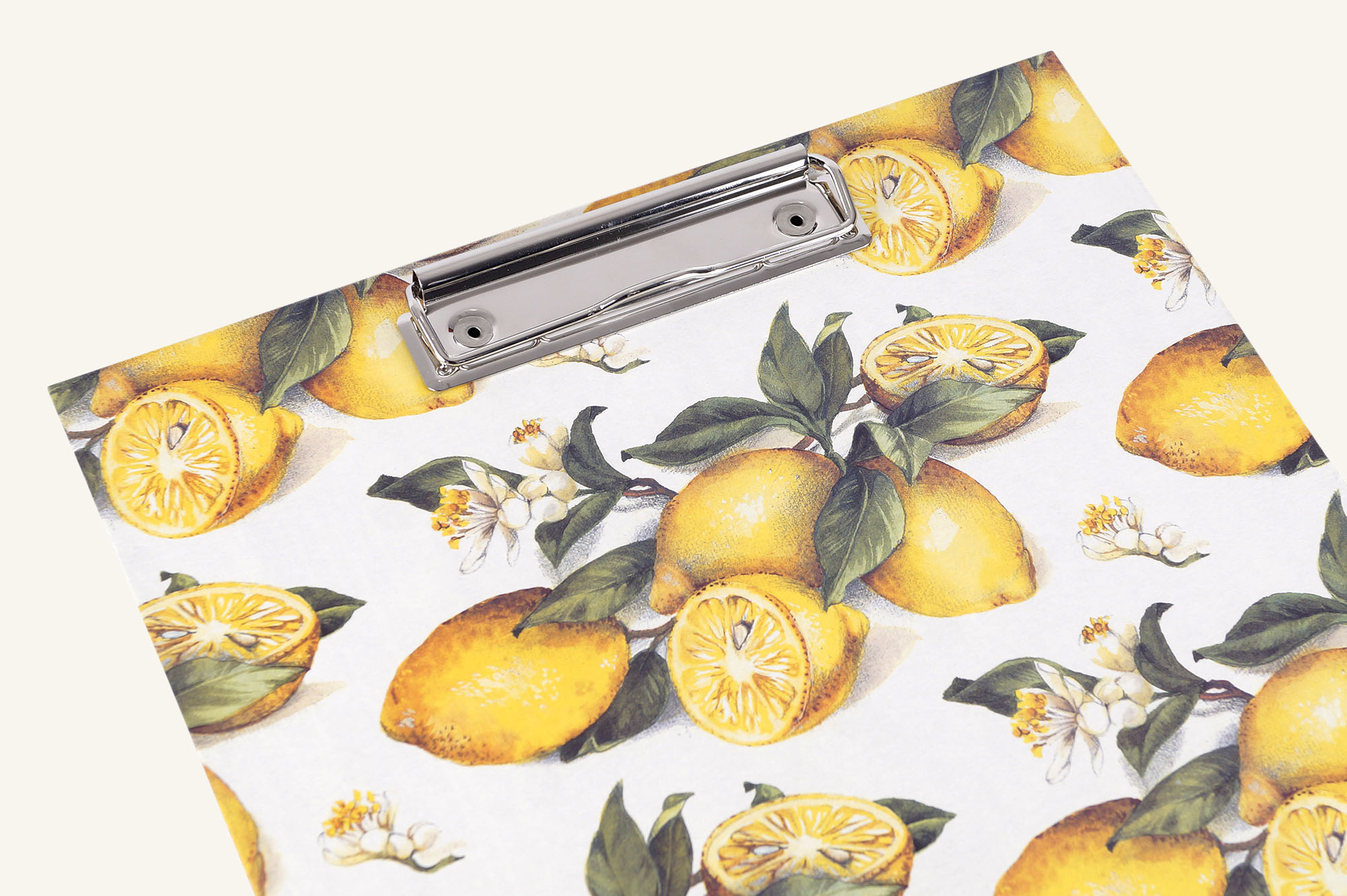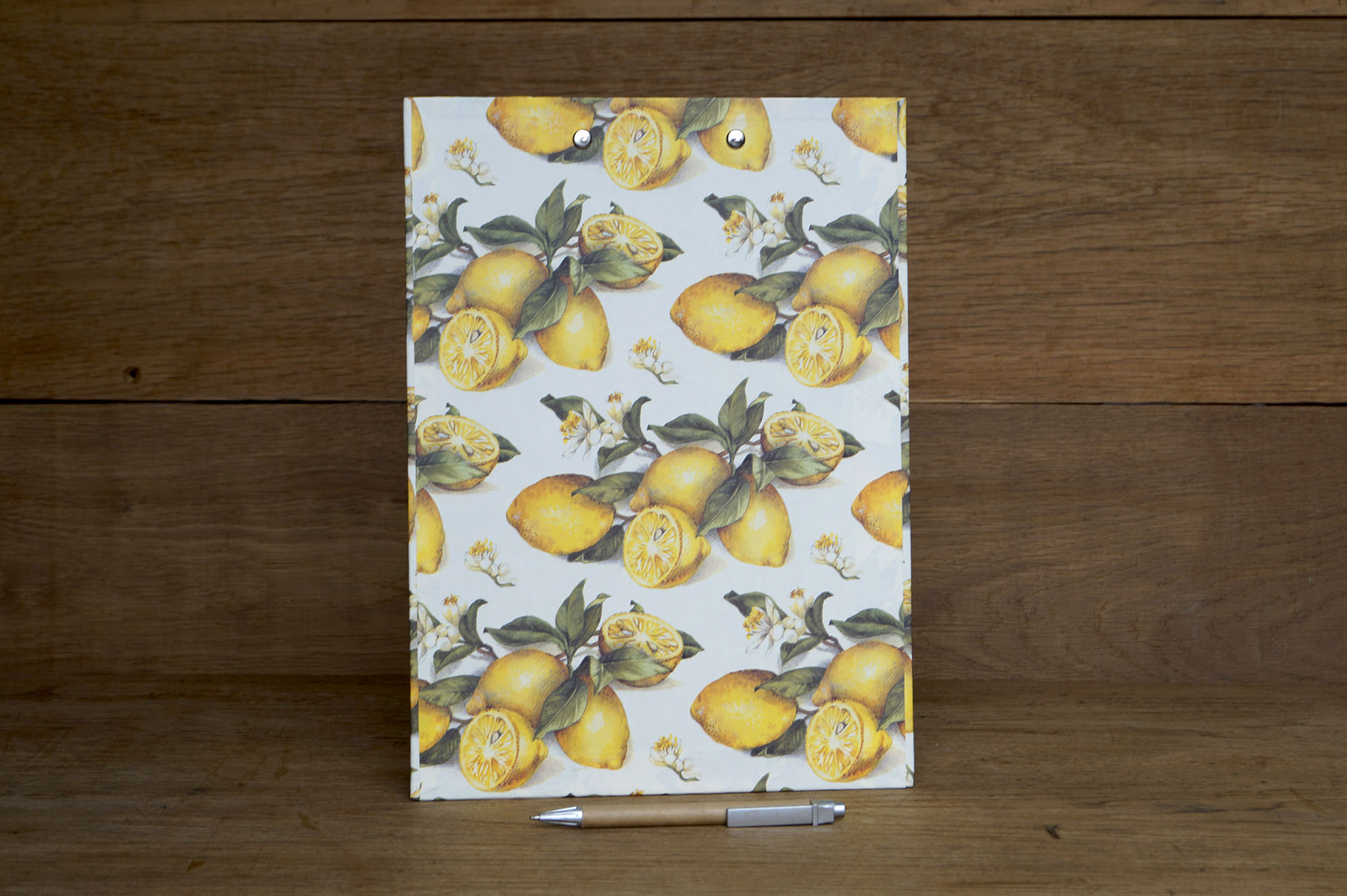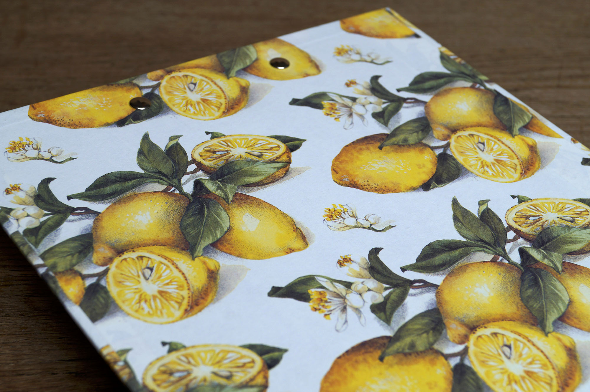 Fein gezeichnete Zitrusfrüchte zieren das Einbandpapier unseres Klemmbretts, Zitronen blühen und fruchten gleichzeitig; das ist hier korrekt dargestellt und naturalistisch illustriert.