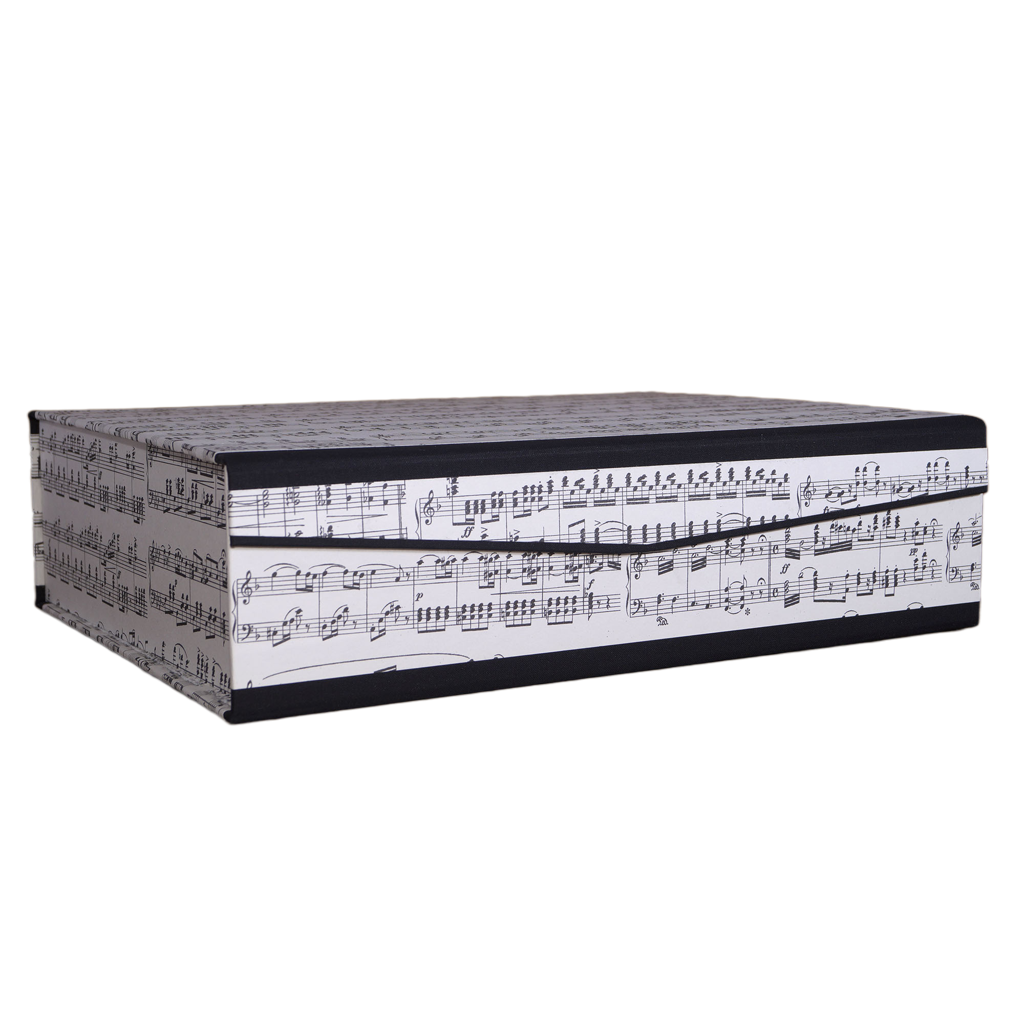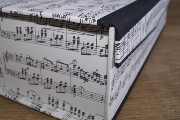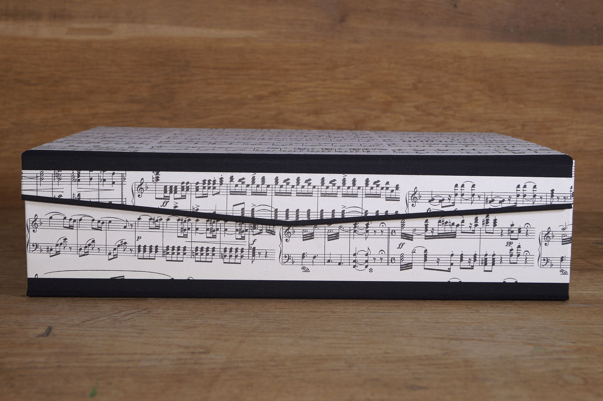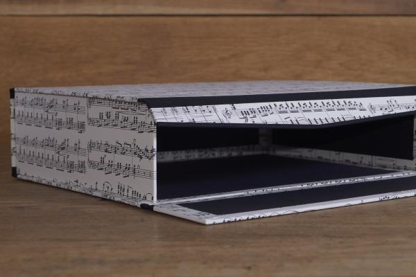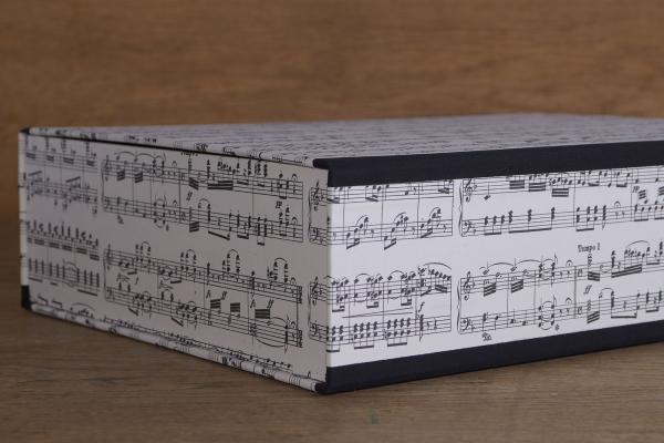 Black linen stripes accentuate the long edges of this designer box. Inside the note box is equipped with black cardboard with a gap to all edges lined with a note motif.
