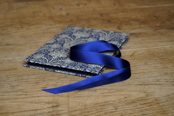 A real satin ribbon serves as a closure, which is wrapped and knotted around the leporello.