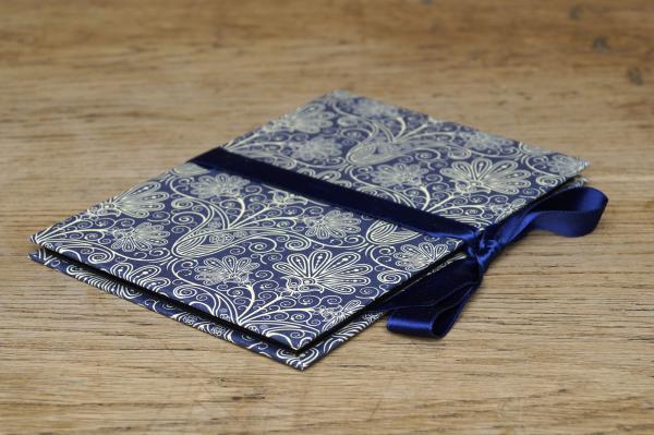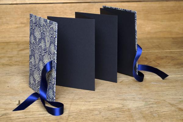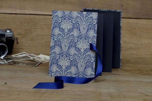 The cover of the leporello consists of fine colored paper with an Art Nouveau-like pattern on a dark blue background, the photo cardboard with accordion folds offers space for individual design.