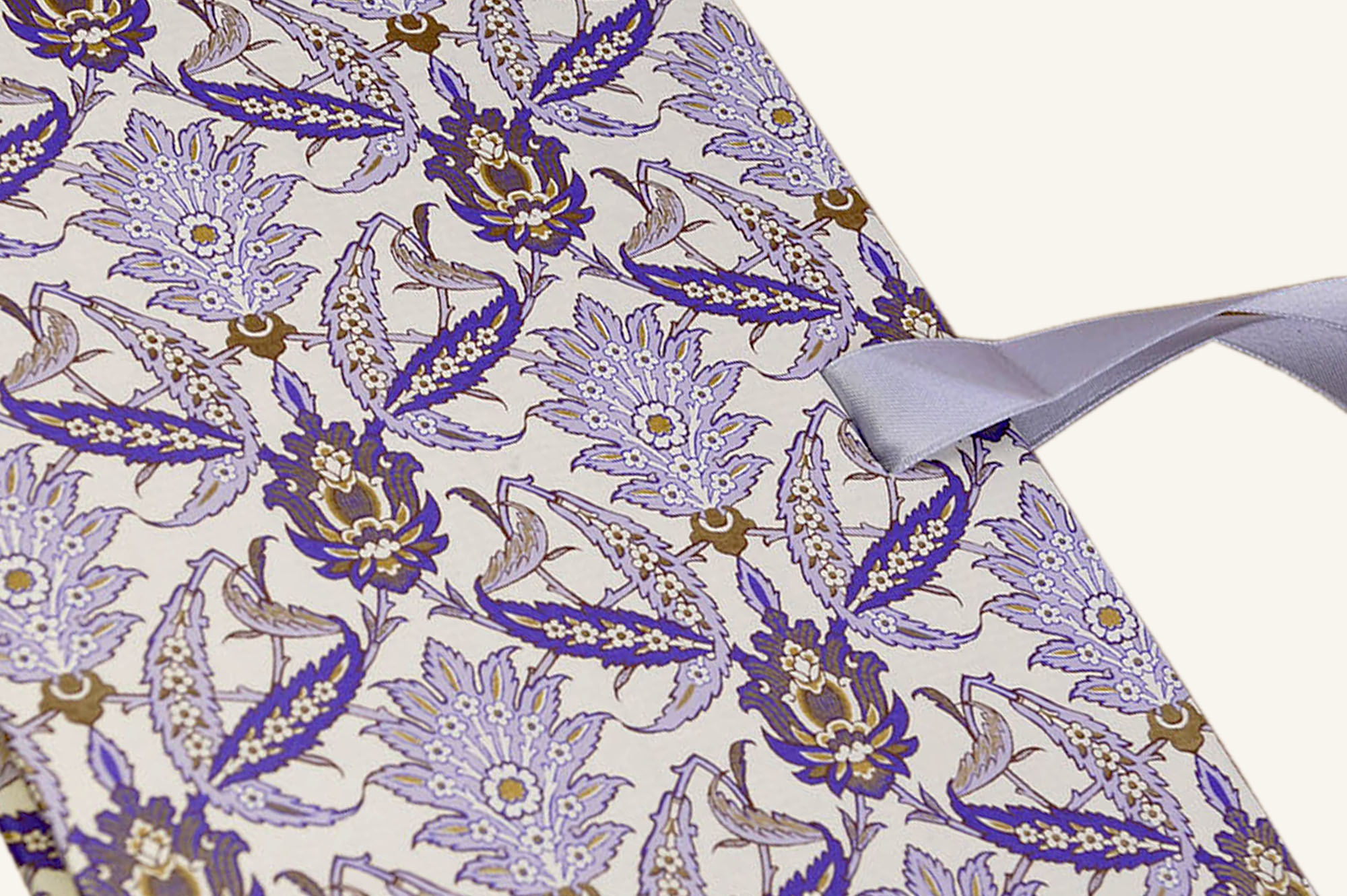 Delicate shades of lilac determine the cover made of the finest Italian colored paper. Discreet gilding sets highlights on the paper.