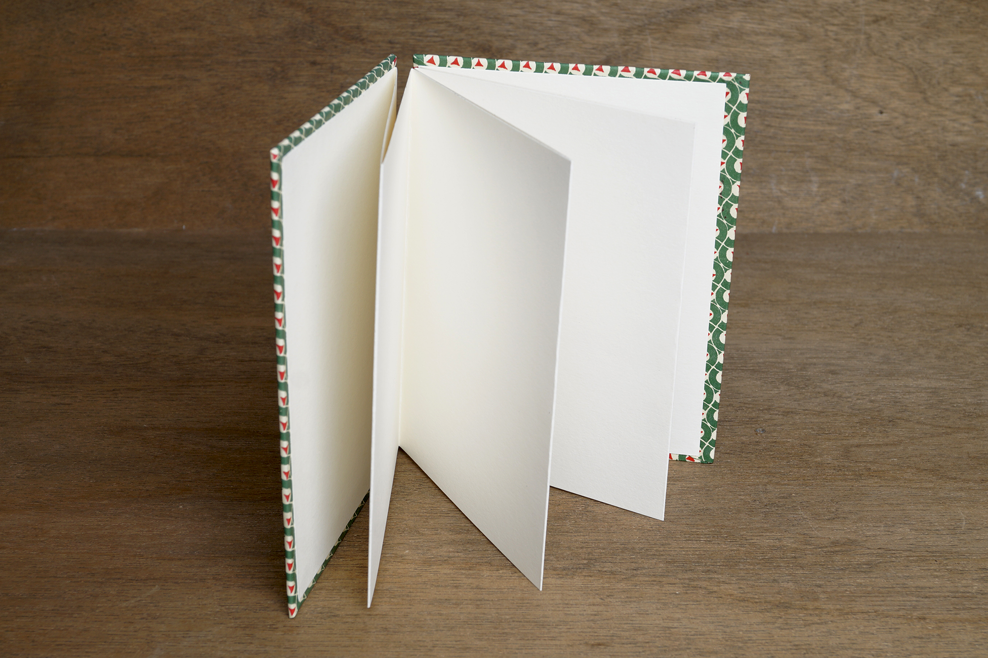 A leporello can be opened like a book and then pulled apart like an accordion in order to view the pictures. The folding creates space for 8 photos on the front and 6 photos on the back. Black or cream-colored cardboard is optional.