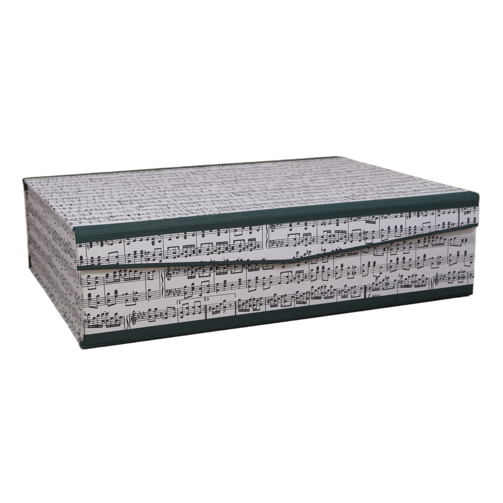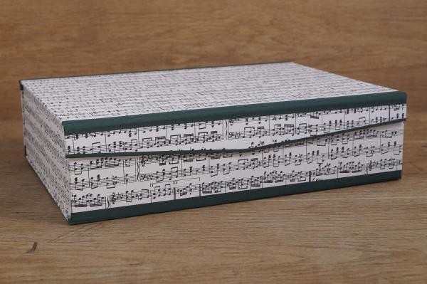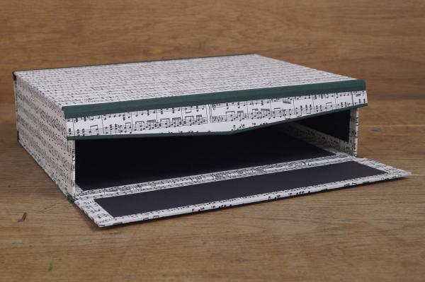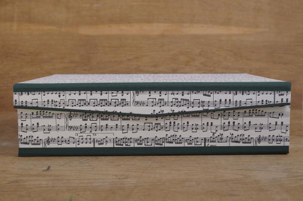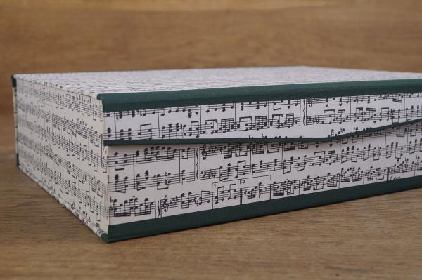 Black linen stripes accentuate the long edges of this designer box. Inside the note box is equipped with black cardboard with a gap to all edges lined with a note motif.