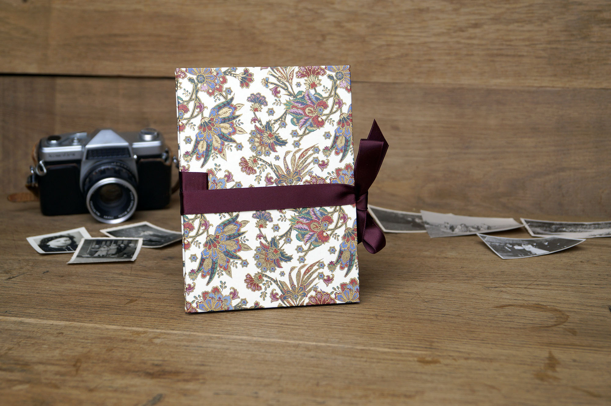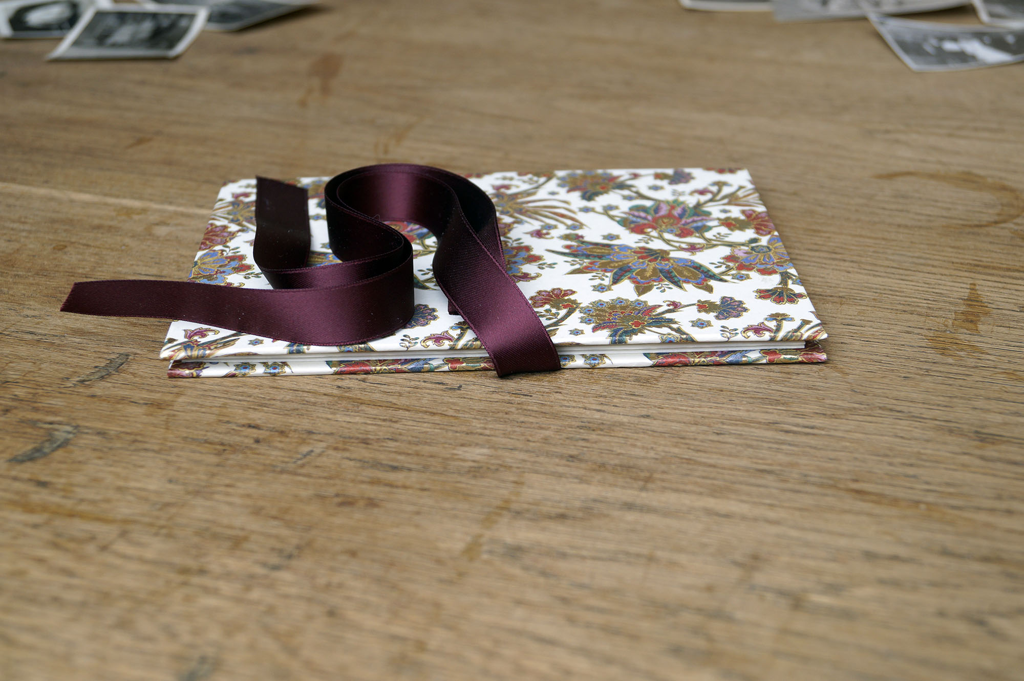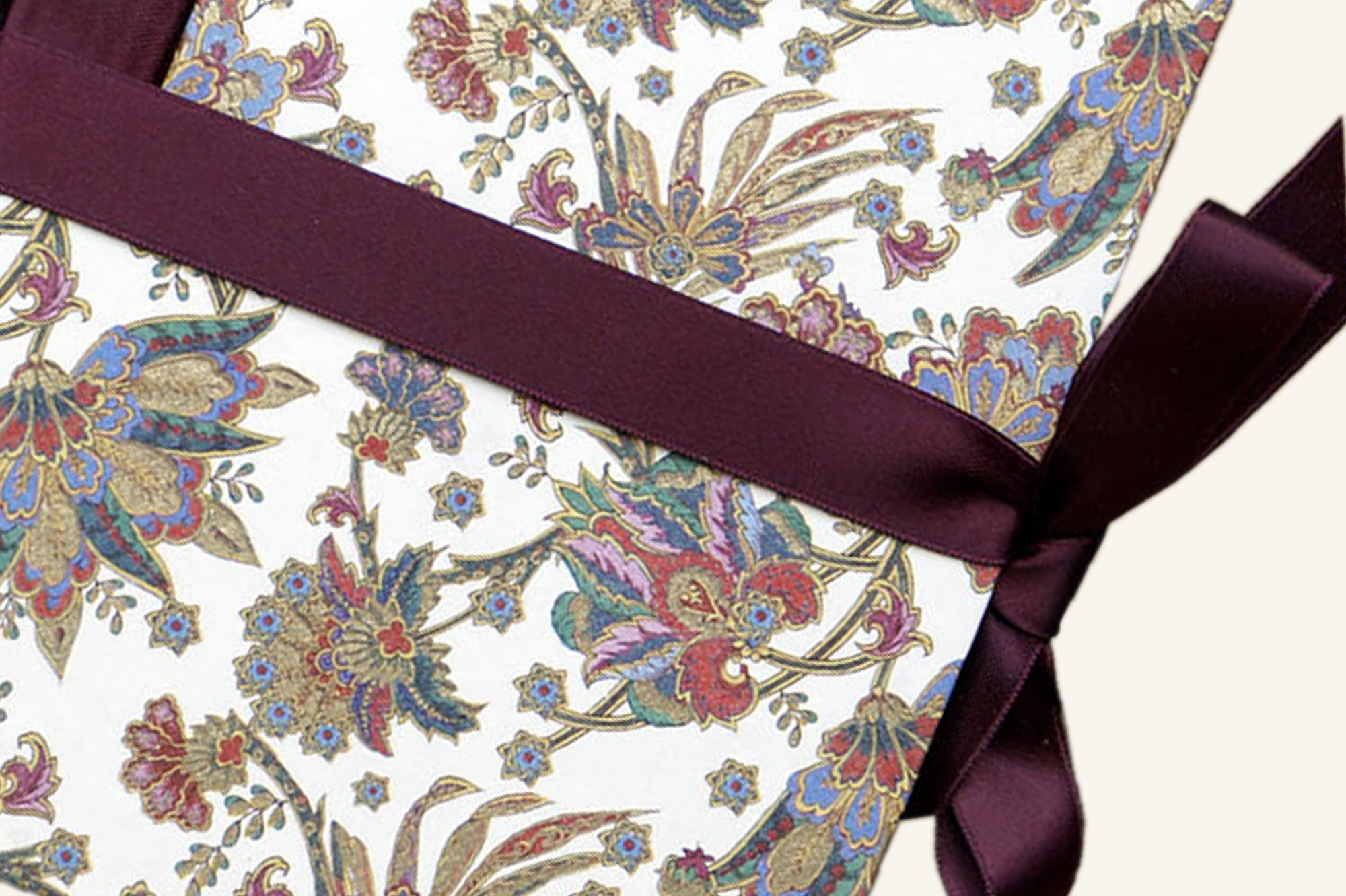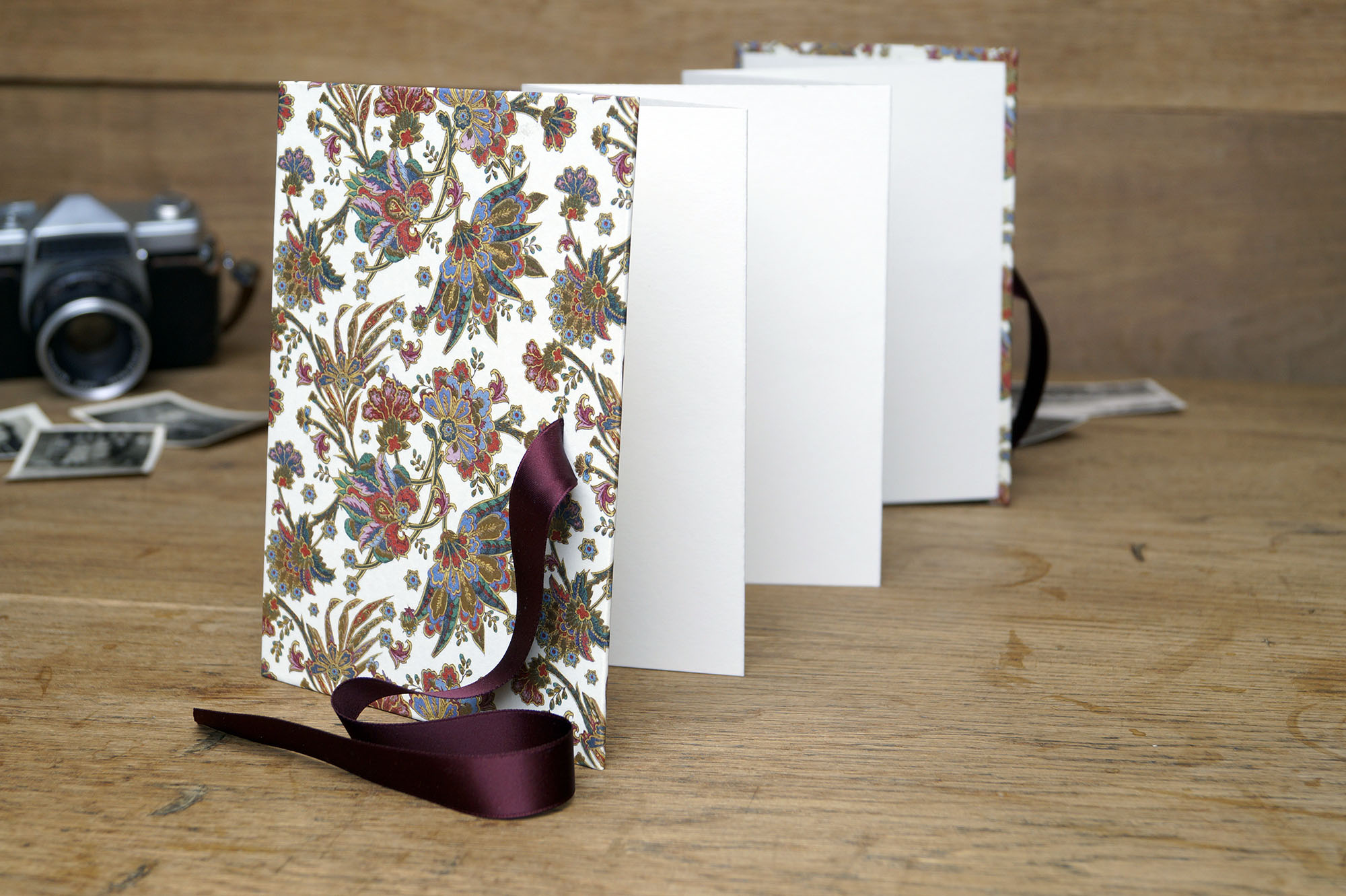 Florentine paper with partial gilding adorns the cover of this leporello in the "Schreibweise" design. Two fine satin ribbons can be wrapped around the leporello and tied into a pretty bow.