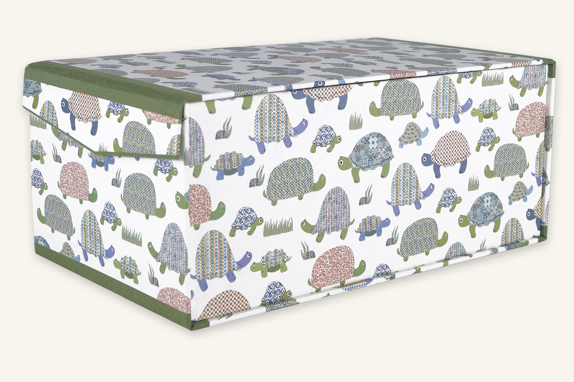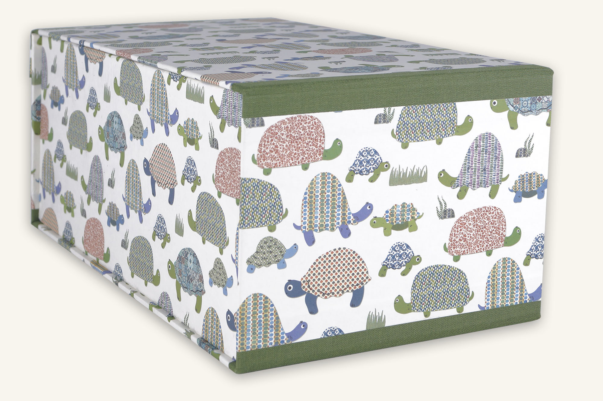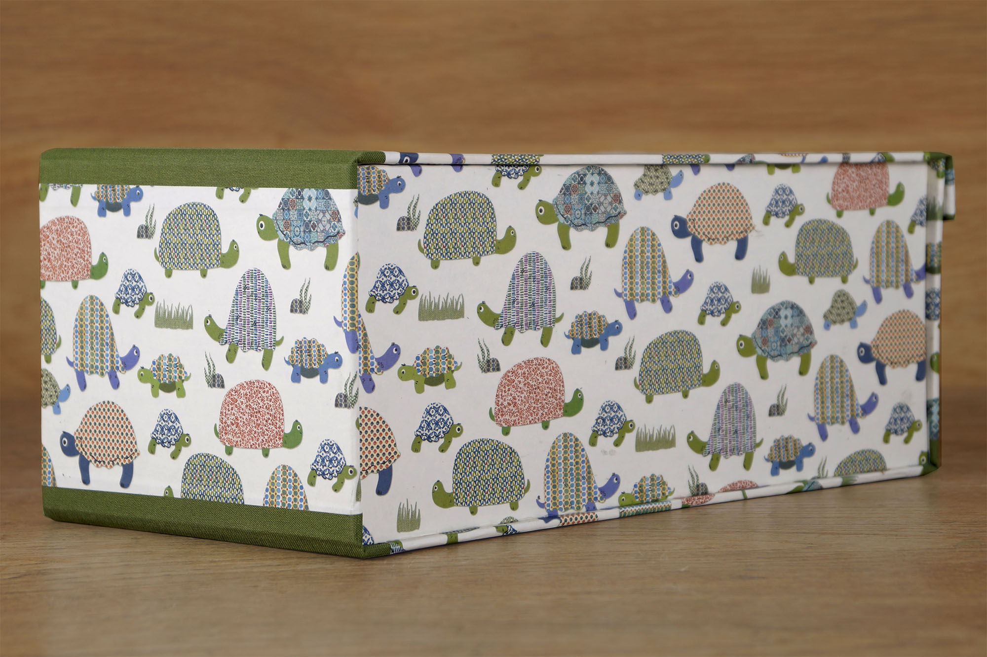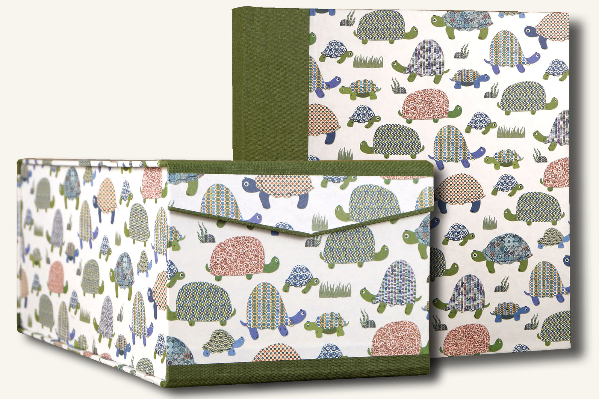 Children's photo album and photo box with imaginatively depicted turtles on the cover.