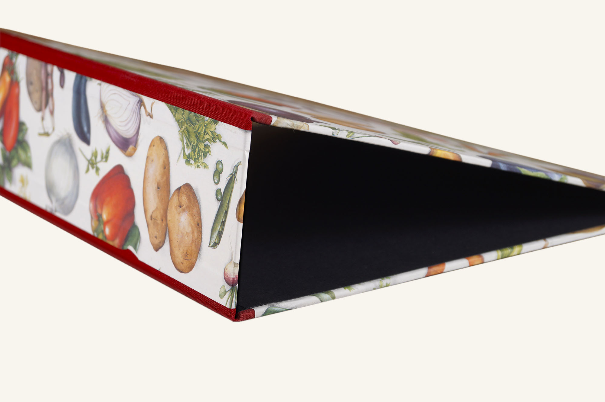 Tomato red linen (alternatively dark green linen) delimits the recipe folder on the shelf from the cookbooks on the right and gives it a frame. At the same time, it reinforces the stressed hinge edge.