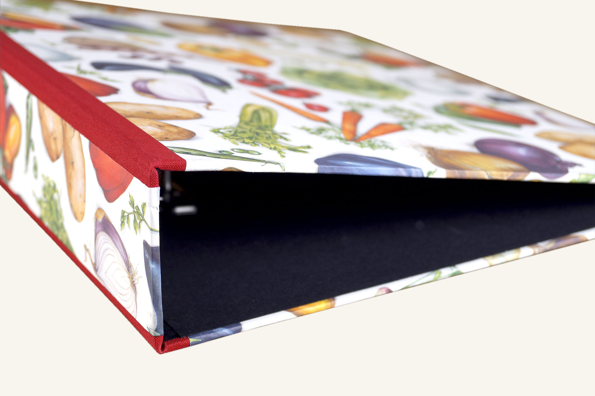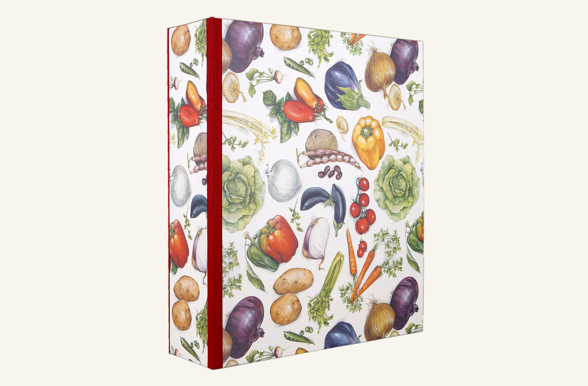 This recipe folder suggests what is in it through the cheerful, colorful jumble of different types of vegetables. Juicy red tomatoes, yellow peppers, sweet carrots, potatoes, hearty onions and other garden delights encourage you to collect and file recipes.